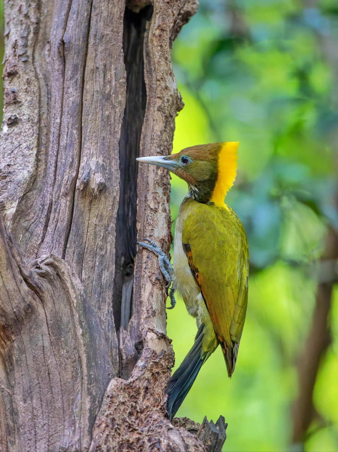大黄冠啄木鸟,Greater Yellownape,䴕形目啄木鸟科大黄冠啄木鸟属。是一种大型的黄绿色啄木鸟。它们分布在东南亚,我国南部,以及喜马拉雅山南麓的中低海拔森林里。在我国很罕见,是国家二级保护动物。