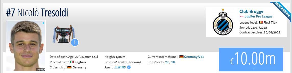 【布鲁日中锋 现场观战米兰】今天在圣西罗球场,还有一位特别的观众 —— 效力于布鲁日的意大利裔德国籍前锋 尼科洛・特雷索尔迪,赛后 特雷索尔迪与莱奥合影留念。这位2004 年出生于卡利亚里、但在德国长大的年轻前锋,从未掩饰过对红黑军团的热爱,2025年10月接受采访时谈到米兰:“显然,我非常关注意大利足球。我的梦想一直是为米兰效力,作为一名红黑球迷,我一直密切关注着米兰。”特雷索尔迪出自于汉诺威,2025年7月加盟布鲁日,本赛季在联赛中20场5球2助攻,在欧冠中6场2球1助攻,分别是在客场对阵摩纳哥和巴塞罗那的比赛中打进的欧冠进球。目前身价1000万,不知道未来有没有机会圆梦米兰。大圣聊球大圣聊球意甲意甲AC米兰AC米兰
