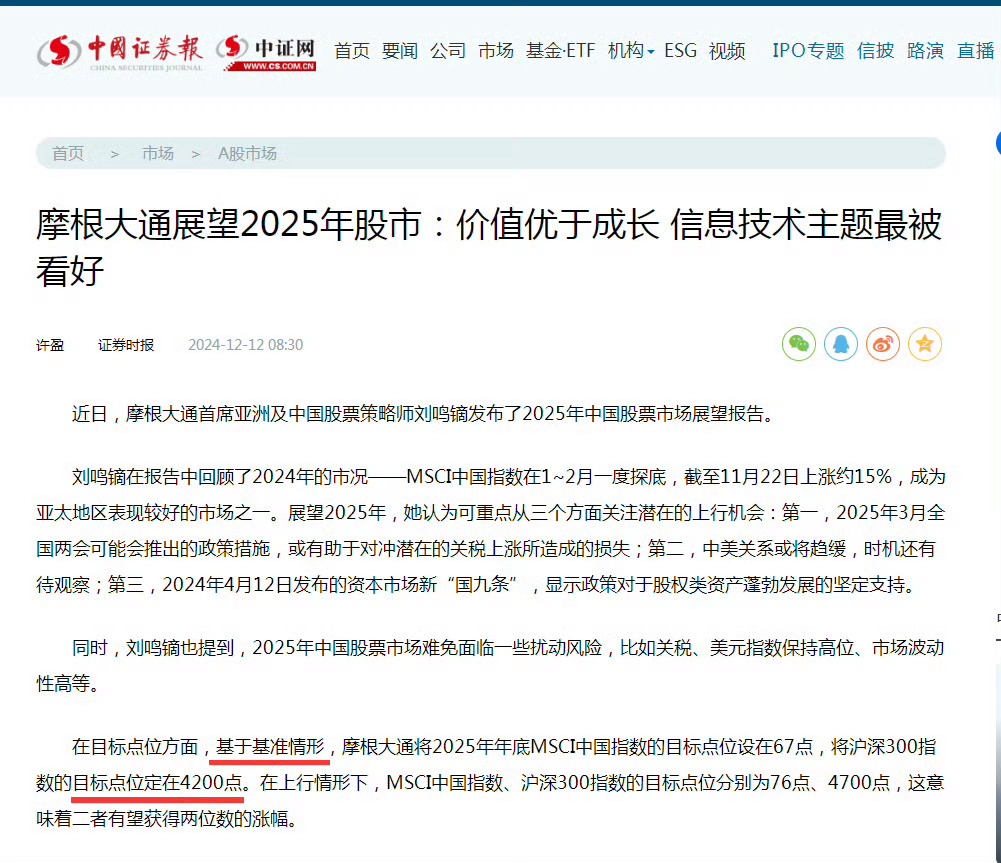 2025年最后半周交易日。沪深300目前今年涨幅18.3%,点数4657点。超越小摩基准情形目标点位的4200点,与小摩去年底预测的上行情形的点位4700点基本一致。ps:关于2026年,摩根大通预测的基准点位是5200点,上行情形的点位6000点,可谓是非常乐观了。
