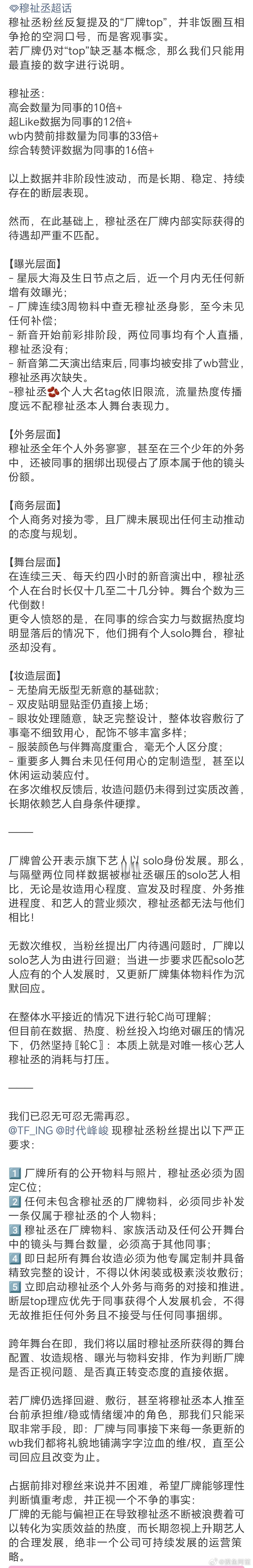 穆祉丞粉丝向时代峰峻TFing厂牌维权,要求归还穆祉丞应有待遇,拒绝捆绑。支持孩子维权,最近他确实受了挺多委屈的。朝朝穆穆