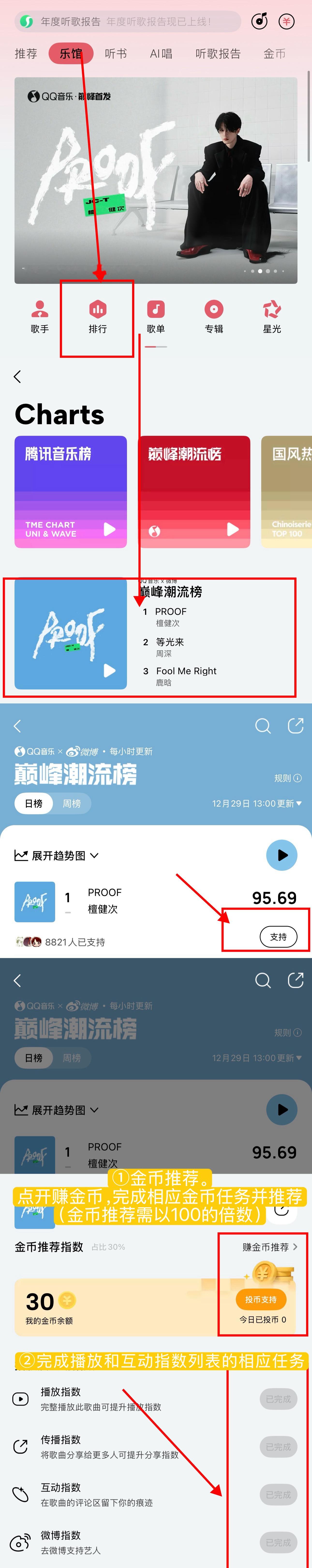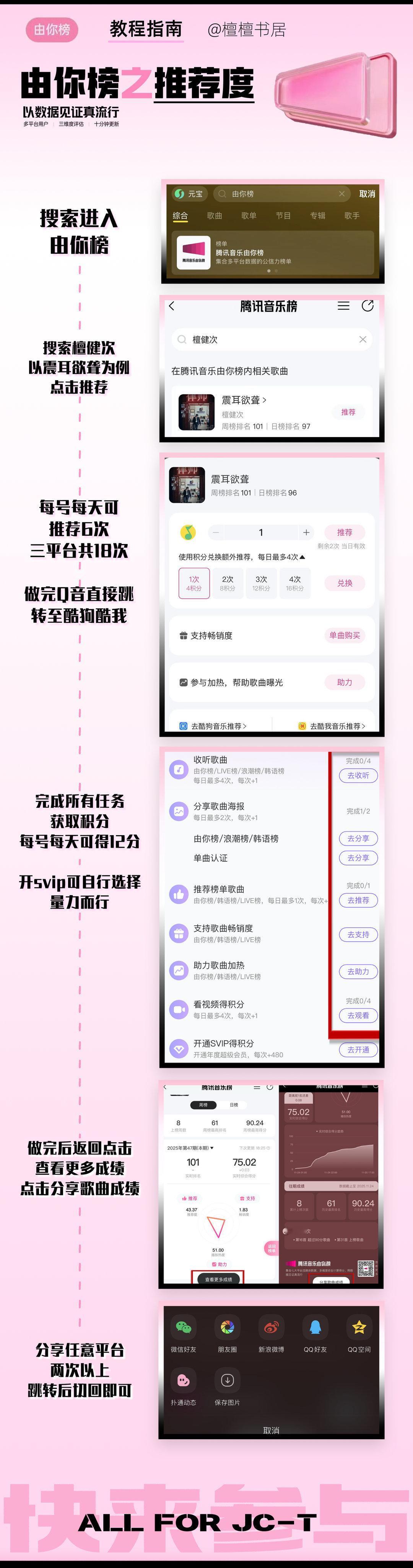 目前打榜需要做的有:由你榜和巅峰榜,这两个是不同的榜单,都需做!⚠️由你有三个维度,分别是:推荐度,畅销度和歌曲加热,大家看图(p123),付费部分单曲购买都要购买!!!⚠️巅峰榜看p4,做微博指数的时候点评完要+15字文案发送,不然不计入!然后就是歌曲和专辑的收藏,分享和增评,增评可以用百度圈子!(p5678)没做的速来做,现在日榜峰值是97.24,不够!!!
