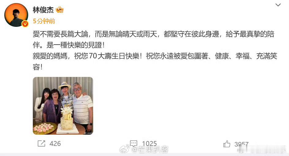 林俊杰官宣恋情 2025年最后一个娱乐爆文还挺甜蜜。官宣恋情的林俊杰,给妈妈庆祝