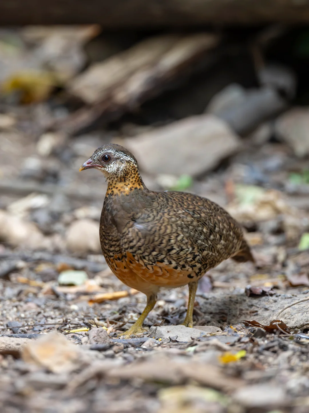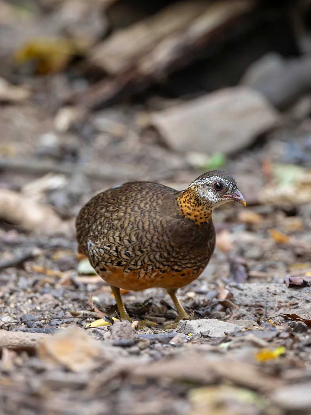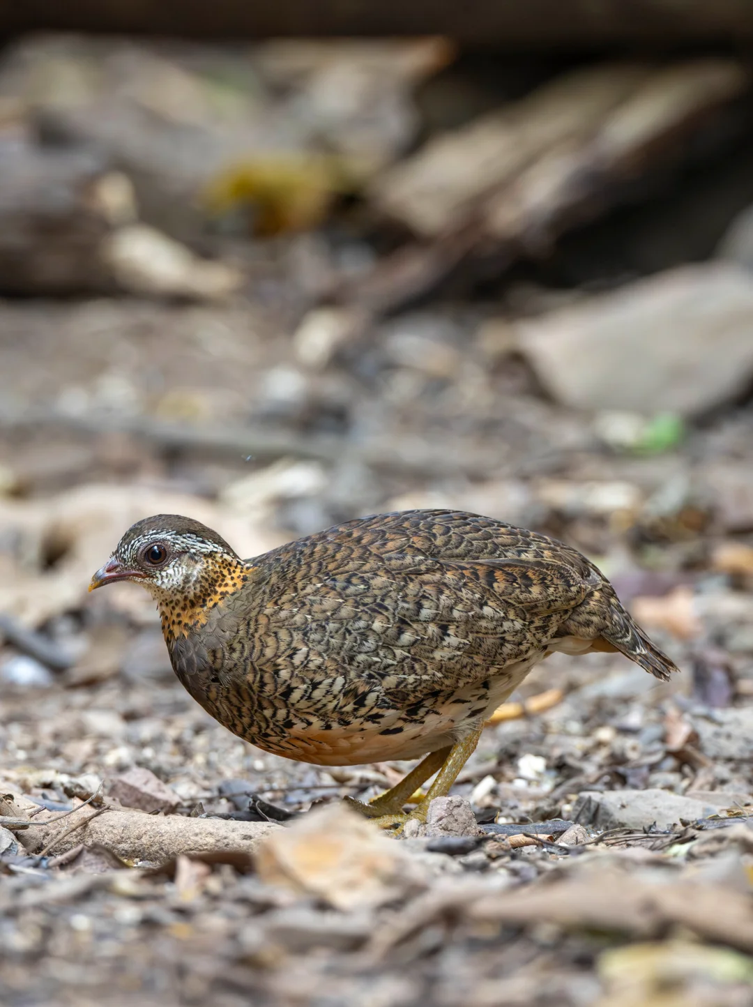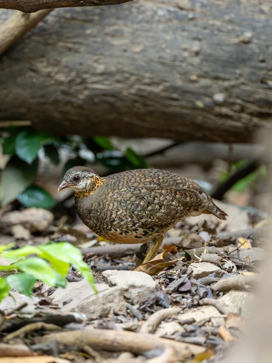 原创拍摄 绿脚树鹧鸪,Green-legged Partridge,鸡形目雉科Tropicoperdix属。它们分布在东南亚森林里的,我国云南省属于边缘分布,通常栖息在茂密植被中。 绿脚树鹧鸪以其独特的绿色腿部而著称,虽然我觉得是黄绿色。它们全身棕色带一些斑驳,脸部白中带条斑,喉部橙色带圆斑。 绿脚树鹧鸪本身比较少见,在西双版纳野象谷是热门点位,不过也很不稳定,去过两次空军,真是让人沮丧,还是在东南亚加新成功了。