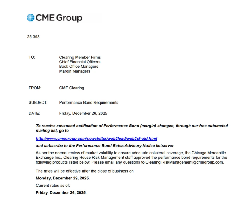 消息面上,芝商所(CMEGroup)于12月26日发布重大保证金调整通知称,将于12月29日(星期一)收盘后,全面上调黄金、白银、锂等金属期货品种的履约保证金。