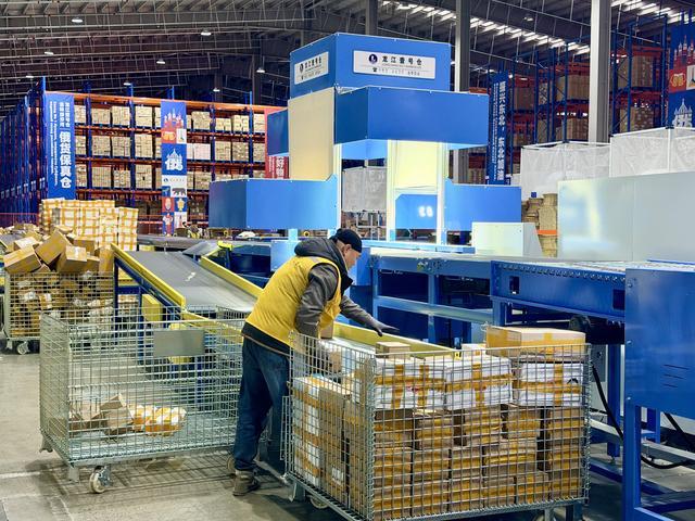 在天府盛俄品龙江壹号仓,工作人员在分拣快递。新华社记者刘赫垚摄