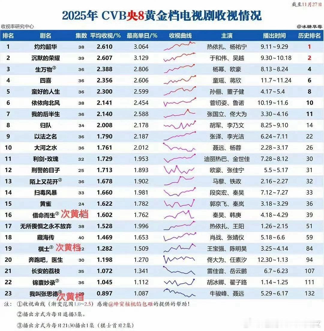 央视今年黄金档收视率,恭喜上榜的演员。我一直觉得上星收视率不仅跟剧情题材有关,上