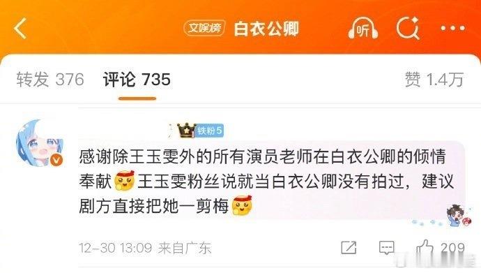 龚俊粉丝在白衣公卿官博抵制王玉雯,要求删掉王玉雯戏份……好像是因为王玉雯粉丝对接