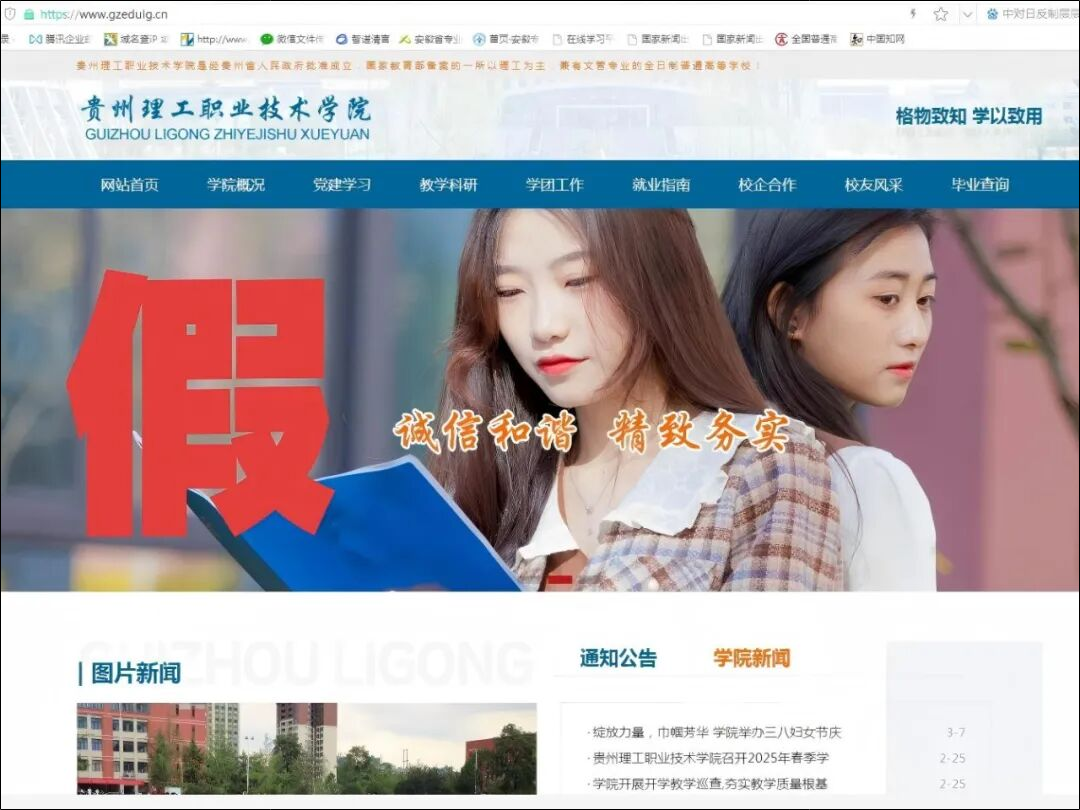 案例六:假冒学校网站。不法分子通过炮制并不存在的学历教育“学校”,如贵州理工职业技术学院等,发布虚假招生信息,发放虚假大学录取通知书,误导考生及家长,骗取钱财。