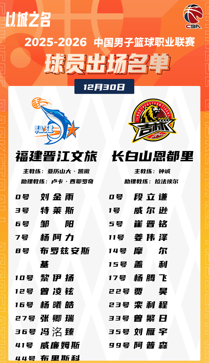 虎扑12月30日讯今日CBA常规赛,福建对阵吉林的大名单已经出炉。