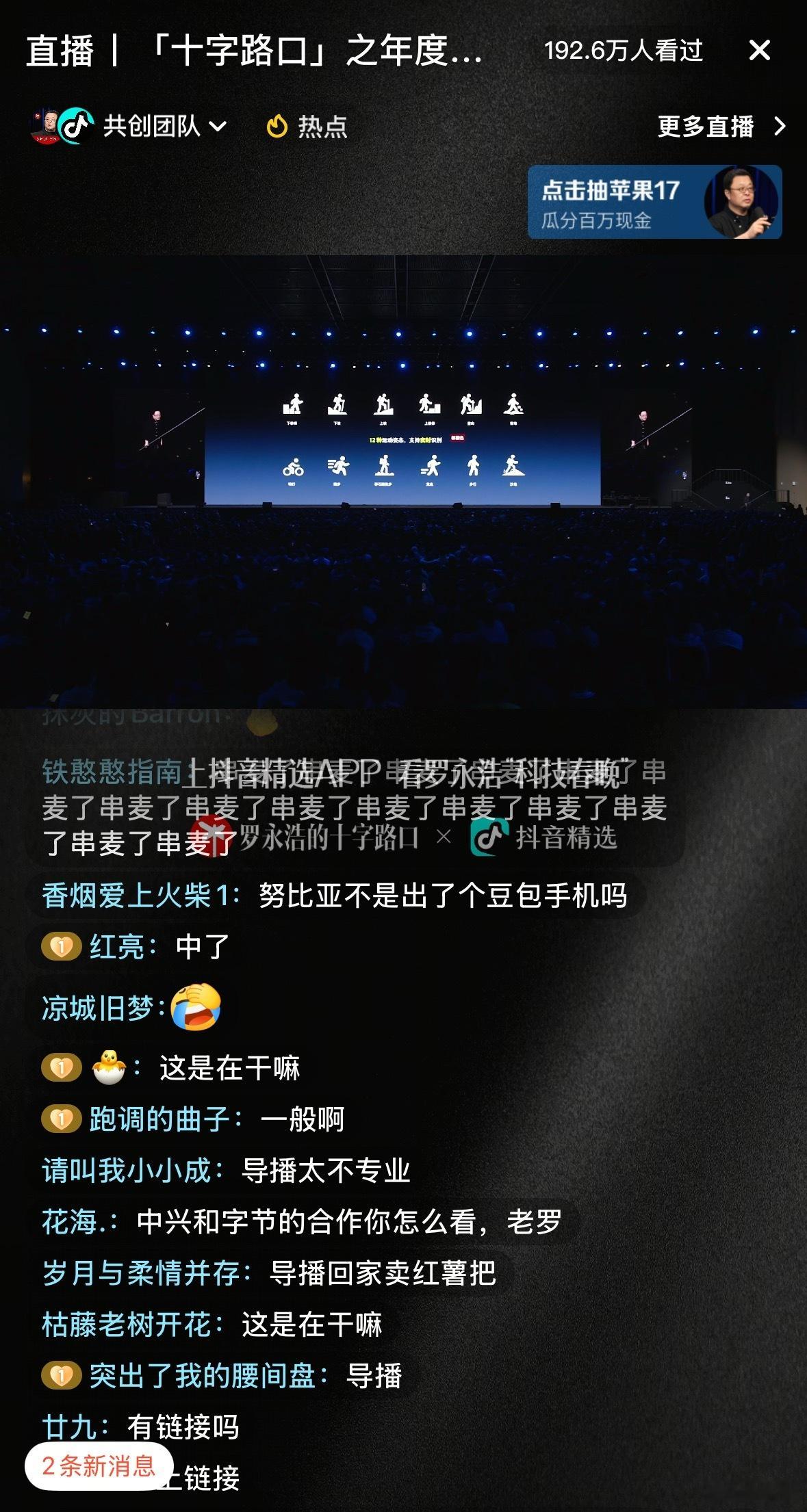 罗永浩科技春晚到目前为止没有任何新产品,感觉就是直播带货大会,不知道晚点会不会有惊喜。这次的直播团队也比较拉垮,迟到了40分钟+放错了两段视频,弹幕也一直在吐槽直播画面看不清楚。 罗永浩迟到超40分钟