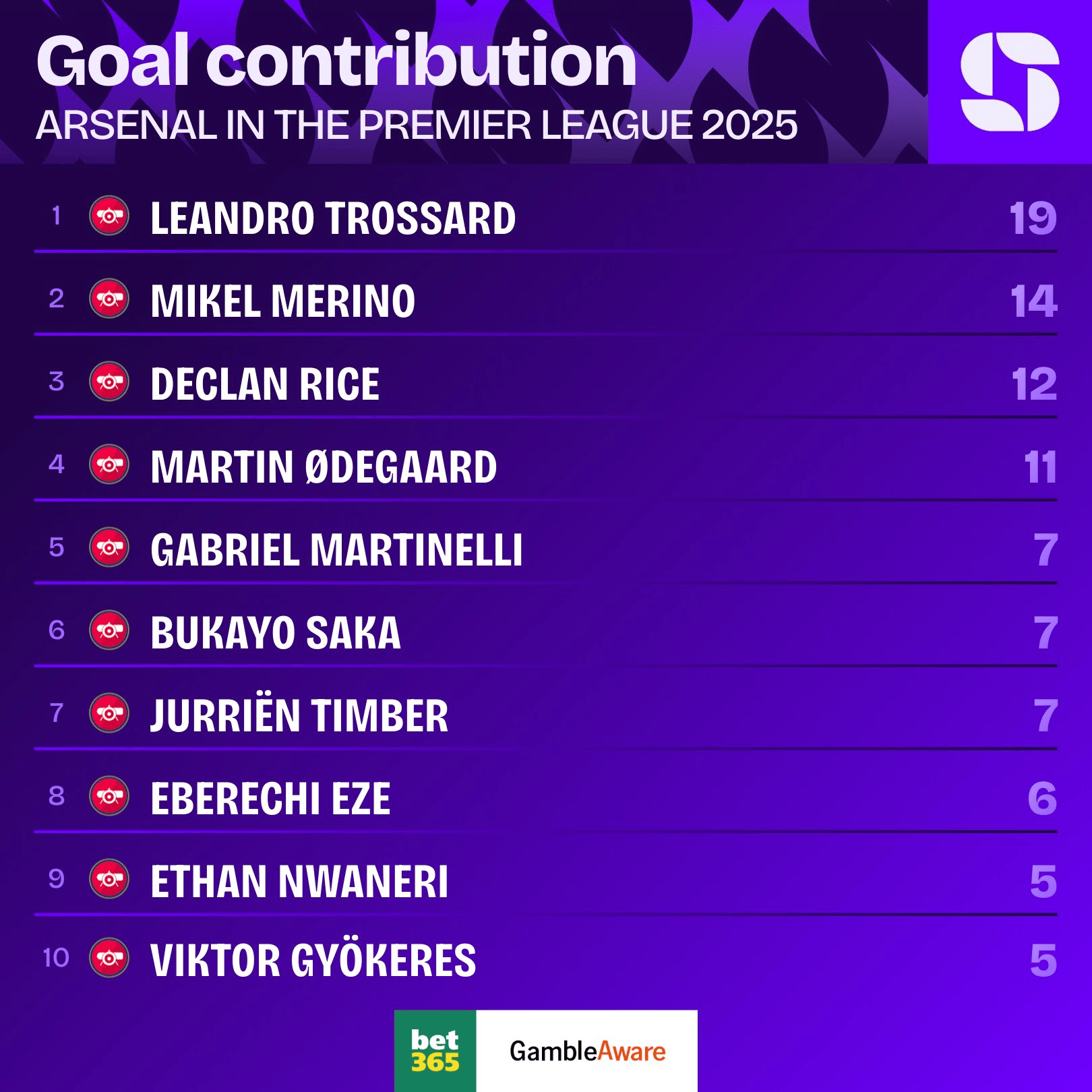 虎扑12月31日讯阿森纳2025英超的全部比赛已经结束。数据网站squawka统计了2025阿森纳队内英超参与进球榜。