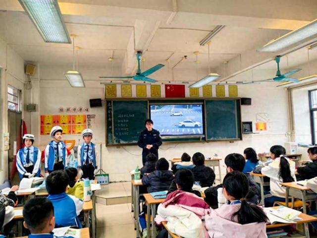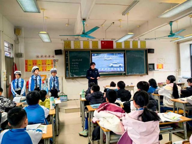 课堂上,宣传人员结合学生日常出行实际情况,系统讲解涉学生交通事故的成因及预防要点,重点强调步行横穿马路、攀扶车辆、道路追逐打闹等危险行为的严重危害,叮嘱同学们自觉遵守交通规则,规范日常出行行为。随后,少年交警队的“小交警”们结合同龄同学的出行习惯,向大家普及安全过马路、安全乘车及防范汽车盲区等实用常识,着重讲解“一盔一带”安全防护的重要性,引导同学们骑乘电动自行车时规范佩戴安全头盔、乘坐机动车时主动系好安全带,呼吁全体同学牢固树立文明交通意识,践行安全出行理念。