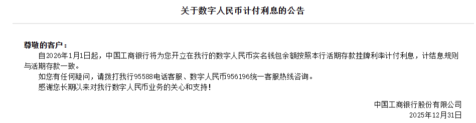 工商银行、农业银行、建设银行等陆续发布公告称,自2026年1月1日起,将为客户开立在上述银行的数字人民币实名钱包余额按照活期存款挂牌利率计付利息,计结息规则与活期存款一致。