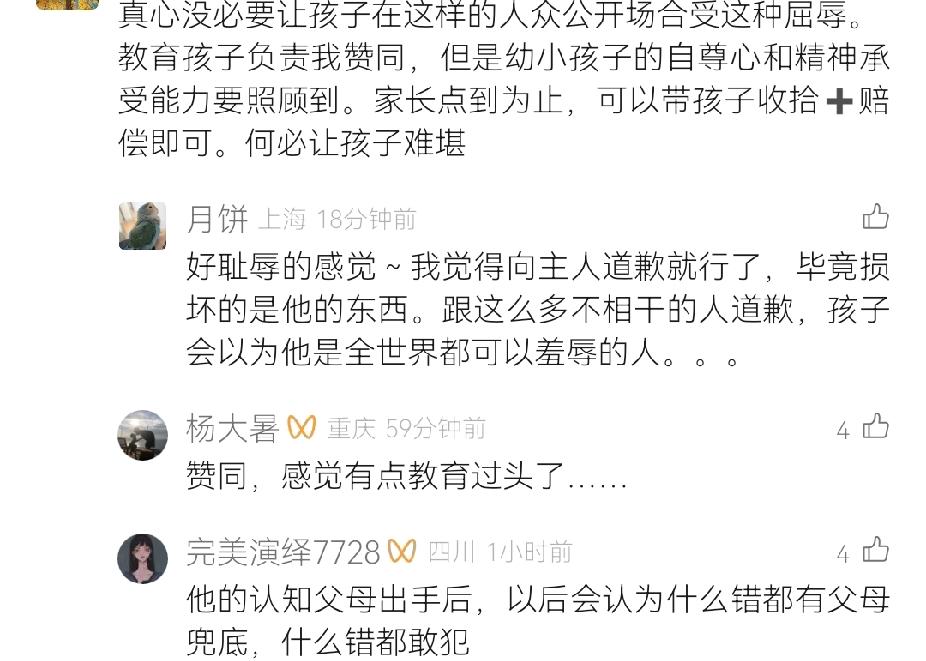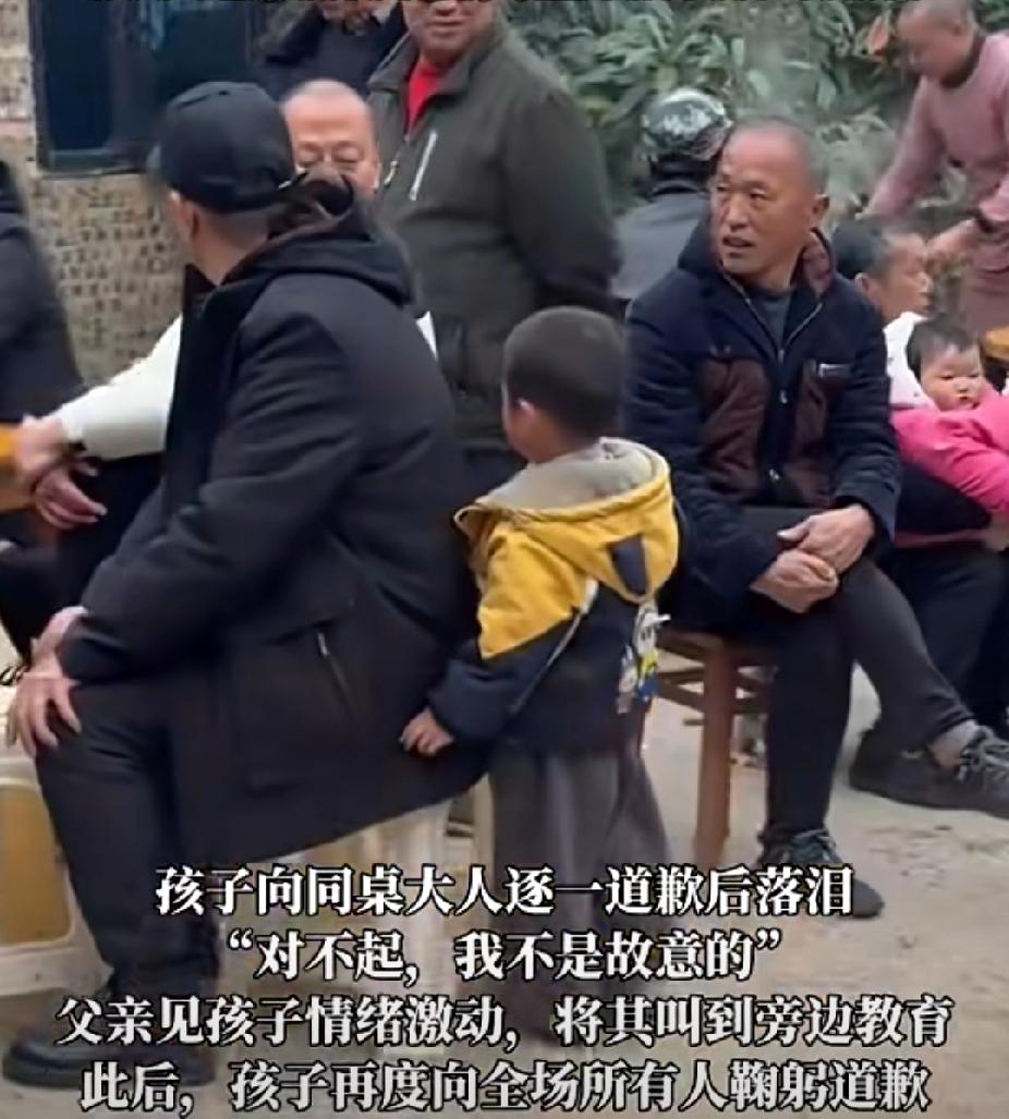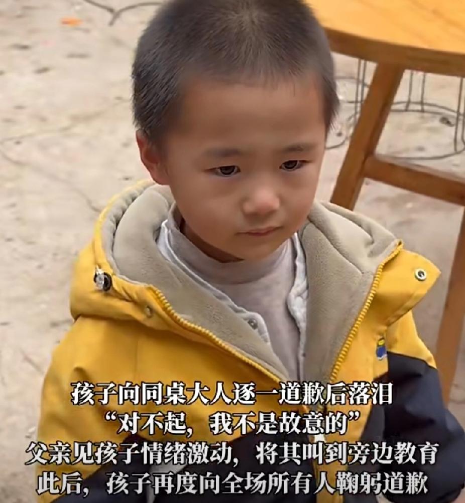 心疼!近日,一男孩吃席时不小心打翻饭菜,被妈妈要求向每一个人道歉鞠躬,真的让人狠狠地心疼了这个孩子。 起初,男孩妈妈在和亲朋好友聊天,突然发现前方饭菜翻倒在地。然后儿子赶紧跑过来向妈妈解释:“妈妈,我只是闻一下味道。” 男孩向妈妈解释的时候已经面露难色,眼中泪光闪闪。 妈妈却严厉呵斥道:“你闻一下味道会变成这样吗?” 妈妈要求儿子一起帮忙收拾地上的饭菜和破碎的盘子和碗,男孩也乖乖照做了。有亲戚看到连忙阻止,担心孩子受伤。 这时男孩已经认识到了自己的错误,妈妈教训过儿子并要求儿子一起收拾也很正常。 男孩已经认识到了自己的错误,眼神看向周围人的时候也带着恐惧。就在这时,妈妈却要求男孩挨个向在场所有的亲戚鞠躬道歉承认自己的错误! 男孩很听妈妈的话,立马跑到其他桌上哭着向每一个人道歉。在场的所有亲朋好友无一例外都表示没关系,并安抚男孩的情绪。 这还没完,男孩哭着向所有人挨个道完歉后,父亲见孩子情绪激动,把男孩叫到一旁安抚情绪并分析事情的来龙去脉,然后男孩再次郑重的向所有人鞠躬道歉。 男孩就这样哭着站在空地上,对着一桌又一桌围着餐桌吃饭的亲戚鞠躬道歉,嘴里还不停说着:“对不起爷爷奶奶叔叔阿姨,是我做错了。” 有网友说:“父母三观很正,家教很棒!” 也有网友说:“没必要让孩子在大庭广众之下受这种耻辱,认识自己的错误,再帮忙收拾,做出赔偿就可以了。” 在我看来,孩子犯了错误后第一时间向妈妈解释,并听妈妈的话承认错误帮忙收拾,这是没问题的。其次,妈妈要求儿子深刻的意识到自己的错误,要求儿子挨个向所有人道歉也是没问题的。但是,在孩子哭着向所有人道完歉后,再要求孩子当着所有人的面鞠躬道歉是不是就有点教育过头了呢? 并且孩子肯定不是故意要将饭菜打翻的,孩子一直在哭一直在道歉,一直哭一直在道歉,他的心里该有多难过呀!如果以后他长大入了社会习惯了这样来承认自己的错误,别人又会如何看待他呢?对此,你怎么看呢?孩子教育 孩子犯错
