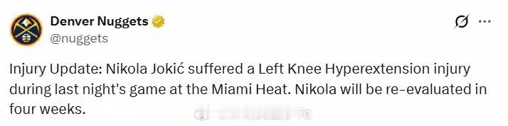 掘金官宣约基奇至少缺阵4周!当选MVP概率跌至第3 亚历山大或蝉联约基奇因伤至少缺阵四周nba 北京时间12月31日,掘金官方宣布,球队中锋约基奇确诊左膝过度伸展,将在四周后接受伤情重新评估。这意味着约基奇至少要缺席四周的比赛,很可能失去评奖资格。约基奇在周二对阵热火的比赛中膝盖受伤。塞尔维亚记者乔尔杰-马蒂奇报道称,这位大个子球员出现膝盖过度伸展症状,但并未遭遇更严重的伤病。球队今日的更新公告证实了这一消息。据名记Shams报道,尽管此次预计缺阵时长将创下约基奇NBA生涯新高,但掘金方面仍松了一口气,因为检查确认这位三届MVP的膝盖韧带完好无损。不过,四周后的复查并不意味着约基奇届时一定能够复出。名记西格尔指出,这位30岁的球星最终可能缺席接近六周时间。在此期间,掘金的阵容深度将面临严峻考验。球队此前已有三名首发球员缺阵:阿隆-戈登(腿筋)、布劳恩(脚踝)和卡梅隆-约翰逊(膝盖)均处于伤病名单中。随着约基奇的伤停,后卫贾马尔-穆雷成为揭幕战首发阵容中唯一保持健康的球员。