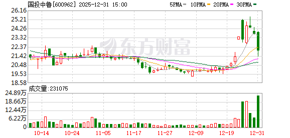 二级市场上,截至12月31日收盘,国投中鲁股价报21.93元/股,跌幅7.35%,最新总市值为57.50亿元。