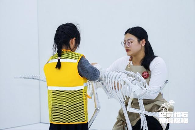 本次展览以多元形式打造沉浸式体验。在研学板块,活动主办方带来了与众不同的科普互动新形式——体验“古生物学家的一天”。观众们不仅可以亲手触摸恐龙腿骨化石实物,更可在现场从一根肋骨开始,完整拼装一个“1:1还原的”恐龙骨骼模型。