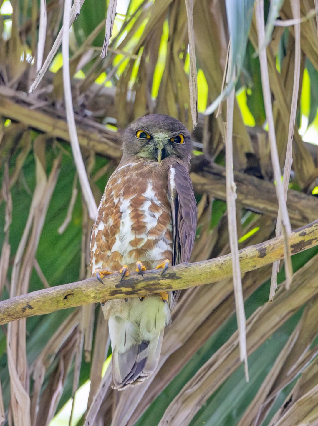 原创拍摄 鹰鸮,Brown Boobook,鸮形目鸱鸮科鹰鸮属。国家二级保护动物。主要分布在南亚到东南亚,在我国南方有留鸟分布,长江流域有夏候鸟分布。 鹰鸮顾名思义,有鹰一样外表的猫头鹰,没有明显面盘,圆圆的脑袋,大而黄的眼睛,不过白天没有完全睁开,看上去像是一只不高兴的小老头。 这只鹰鸮是在我们下榻的民宿的园子里看到的,站在棕榈树上咋一眼真的很难发现。