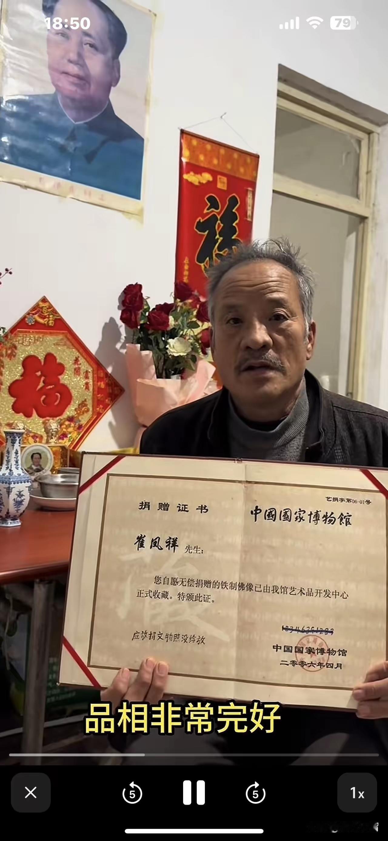 国家博物馆,你看到了吗? 图片上的这个老人叫崔凤祥,他手拿的是国博给他颁发的捐赠证书。 崔先生发视频说,2006年他向国博捐赠了一尊明代万历年间的地藏佛像,文物价值很高。他捐赠时,有侯松园等好几个人在场,并给自己颁发了图片中的捐赠证书。 2009年崔先生到国博想看看那尊地藏佛像,可是令他万万没有想到的是,仅仅时隔三年,国博陈德明主任告诉他,他捐赠的地藏佛像不在馆内,档案没有记载,让他咨询接收地藏佛像的人。 崔先生为此事向有关方面多次反映,十多年过去了,毫无结果。 国博以及有关方面,你们看到了吗?这到底咋回事儿,是不是该给公众特别是崔先生一个答复或回应?