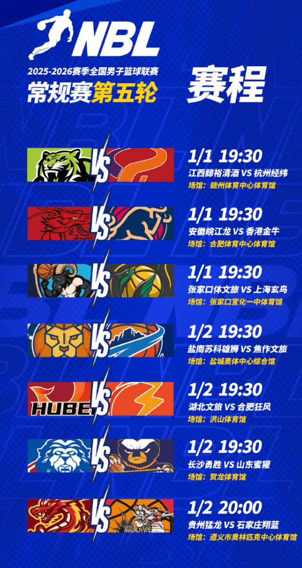 虎扑01月01日讯NBL官方分享第五轮赛程:香港金牛、上海玄鸟今日出战。