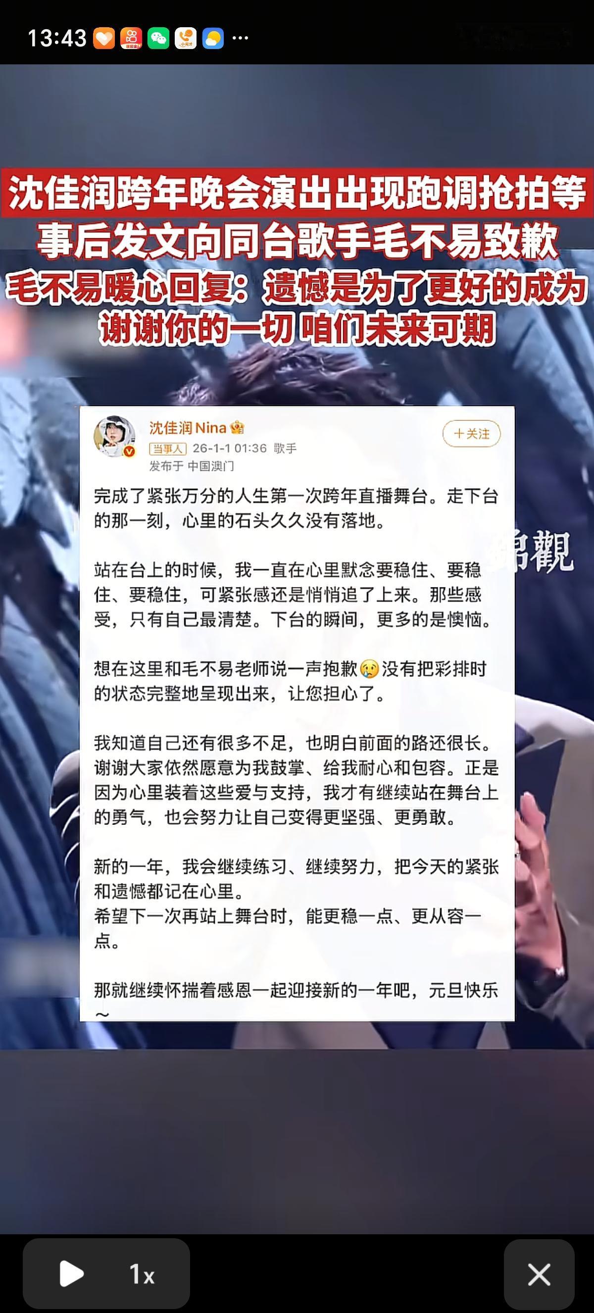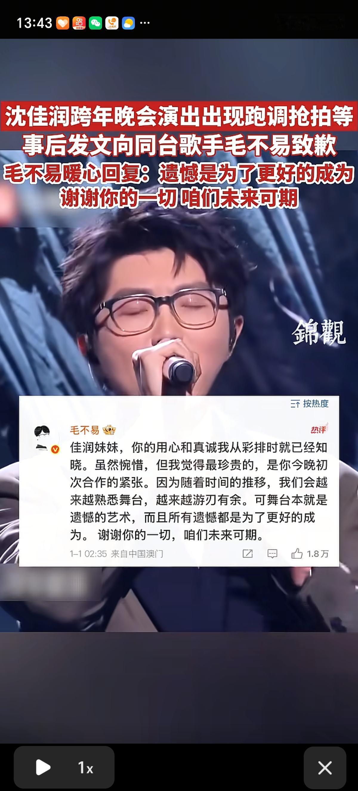 沈佳润开场抢拍唱个“不~”字就马上哑火了,直接心虚做错事的放下话筒,连我这种不会唱歌的都发现问题了。之后副歌“一壶清酒 一身尘灰”高音破音,全程气息不稳、节奏混乱,在跑调的路上一去不复返,太明显了。 一看平时心里就藏不住事,开腔错了之后就好好唱呗,愣是调整不过来。这下子又是鞠躬又是道歉的,真实诚啊! 这大过节的,一首歌愣是唱出了喜剧色彩,比干听歌可好玩多了。本来我是没关注啥演唱会的,一看见沈佳润跑调了,特意把回放视频扒拉出来听听,也瞅了瞅毛不易是谁,不知道有多少人跟我做了一样的事情。