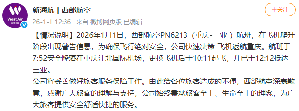 今天,西部航空发布情况说明:2026年1月1日,西部航空PN6213(重庆-三亚)航班,在飞机爬升阶段出现警告信息,为确保飞行绝对安全,公司快速决策——飞机返航重庆。航班于7:52安全降落在重庆江北国际机场,更换飞机后于10:11起飞,并已于12:12抵达三亚。
