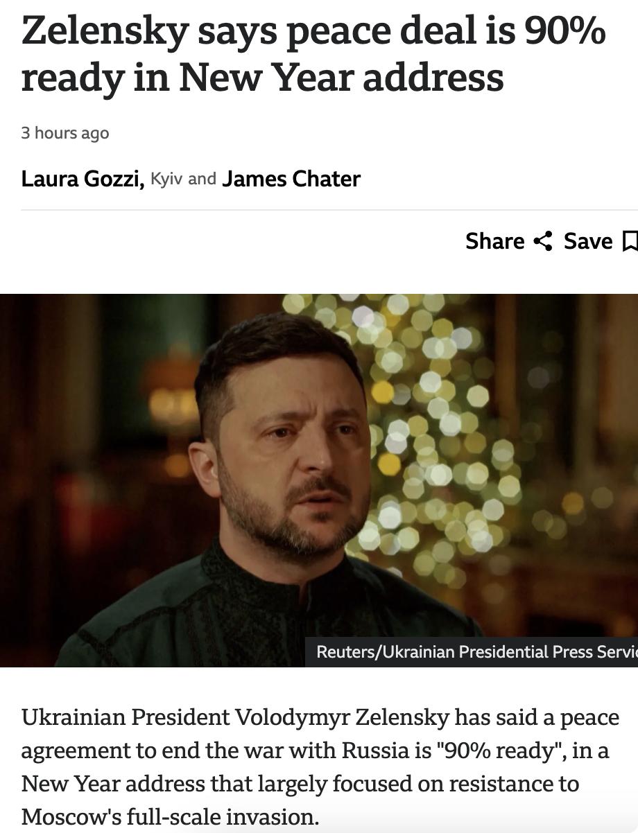 外媒:乌克兰总统泽连斯基在新年讲话中表示,结束与俄罗斯战争的和平协议“已经完成90%”。他强调,剩余的10%将决定和平、乌克兰和欧洲的未来。 他还表示,乌克兰不愿“以任何代价”达成和平,而是希望结束战争,而不是结束乌克兰。泽连斯基提到,乌克兰如果撤出东部顿巴斯地区,将意味着“一切结束”,这与俄罗斯要求在任何和平协议中完全控制顿巴斯地区的要求有关。 俄罗斯目前控制了顿涅茨克的约75%和卢甘斯克的99%。泽连斯基在讲话中感谢了支持乌克兰的国家领导人,并表示,国际社会的意图必须转化为安全保障并通过批准。泽连斯基还透露,美国已提供为期15年的安全保障,但实施时间尚未明确。