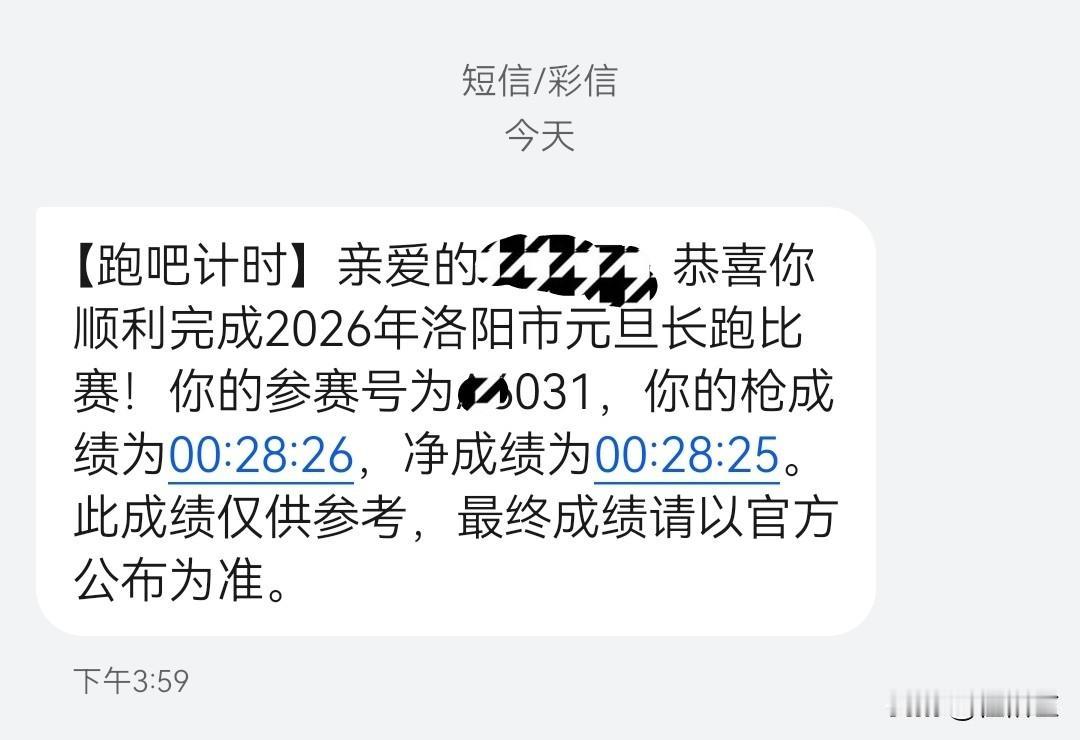 奔向2026! 今天参加了政府组织的元旦长跑比赛,这已经是我连续三年参加比赛了。 以奔跑的方式迎接新的一年,也是以健康的方式迎接新的一年。 第一次报名参加时我将50岁,以年过半百的年纪参加运动比赛,说实在内心有点怯,单位里那么多小年轻都担心跑不下来的活动,我一个年过半百的“老太婆”第一个也是唯一一个报名参赛的。我内心还是有一点小傲娇的,敢于参与就证明我已经赢了。我当年的成绩是小组第12名(共600名选手)。 去年我第二次报名,又是单位里唯一的一位,我更自豪了,年龄大咋滴,我身体素质好,有勇气报名参赛,有能力有信心完赛,这就是我实力的证明。这一年的成绩是小组第7名(共600名选手)。 今年第三次报名,此时的我即将迎来自己52岁的生日,我更为自己的勇气傲娇了。在这样的一把年纪,我以这样的方式迎接2026年的到来,我是不是已经远超同龄人了。 5公里,不远也不近,但能以匀速的速度裹挟在近万人奔跑队伍里一直坚持跑5公里,对于一个年过五旬的中年大妈还是有点难度吧。我做到了,而且自我感觉很棒👍。今年的成绩是小组第13名(共600名选手) 奇怪的是相比去年,在年增一岁的情况下我奔跑的配速竟然还加快了,这更让我骄傲和显摆了。 年龄不是问题,明年加油!