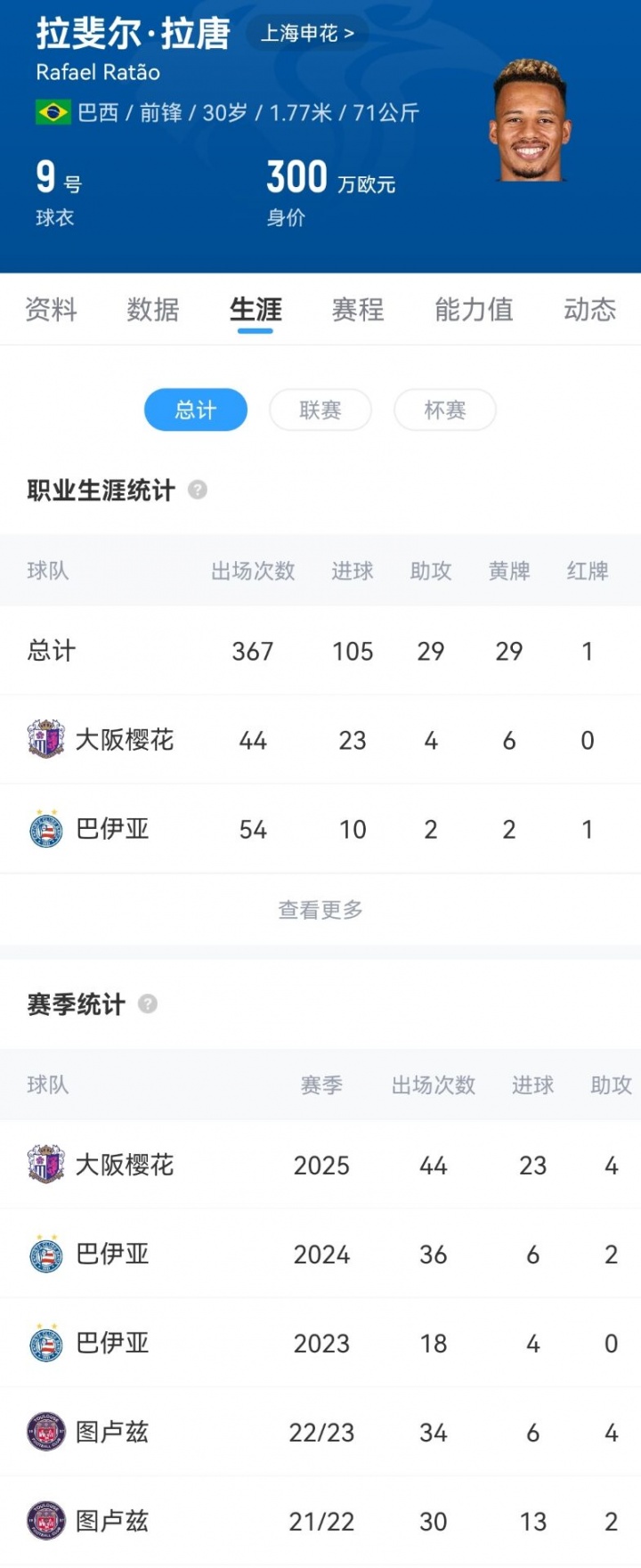 而据德转的数据显示,申花为拉唐支付了200万欧的转会费,目前拉唐的德转身价为300万欧。