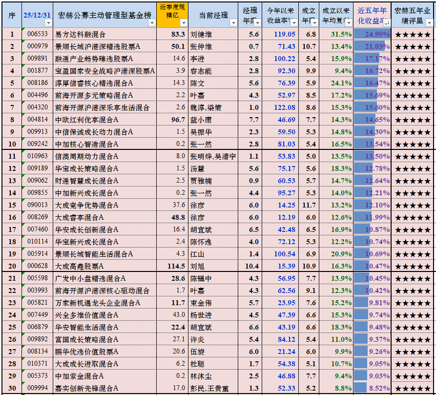 覆盖A股和港股的主动管理型基金2025年年度收益率和近五年年化收益率。