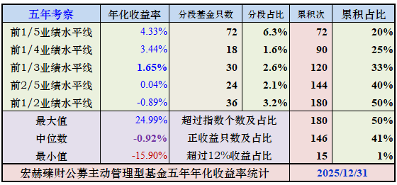 五年年化收益率大于指数年化(-0.92%)的基金有180只,占比50%。