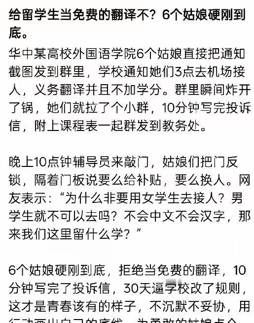 这届00后真给咱们长脸,给留学生当翻译直接说不,还把学校投诉了一把,逼着学校改了规则,真的是好样的。 外语学院6个女生,接到学校通知下午三点去机场接外国留学生,不给学分,学校想白嫖劳动力。 6个女生,直接把桌子掀了。父母供着去大学上学,不是当免费劳动力的,是去学习的,不是给留学生当免费保姆的。 刚接到通知,直接把聊天记录发到群里,10分钟就写出投诉信发到教导处,逼着学校30天改了规则。 辅导员晚上10点来敲门,连门都不开,更别想进门。有理有据不妥协,威逼利诱更不会上你的当,也不怕你日后穿小鞋,这才是青春的模样。 为什么学校热衷于让女生去接留学生呢?让男生去不行吗?不会中文来咱们国家留什么学啊,还得配免费翻译,就差烧香供起来了。 身为女生,脊梁骨都硬起来了,有些人脊梁骨愣是没硬起来。 6名女生硬刚到底,展现了民族脊梁,为她们点赞👍!