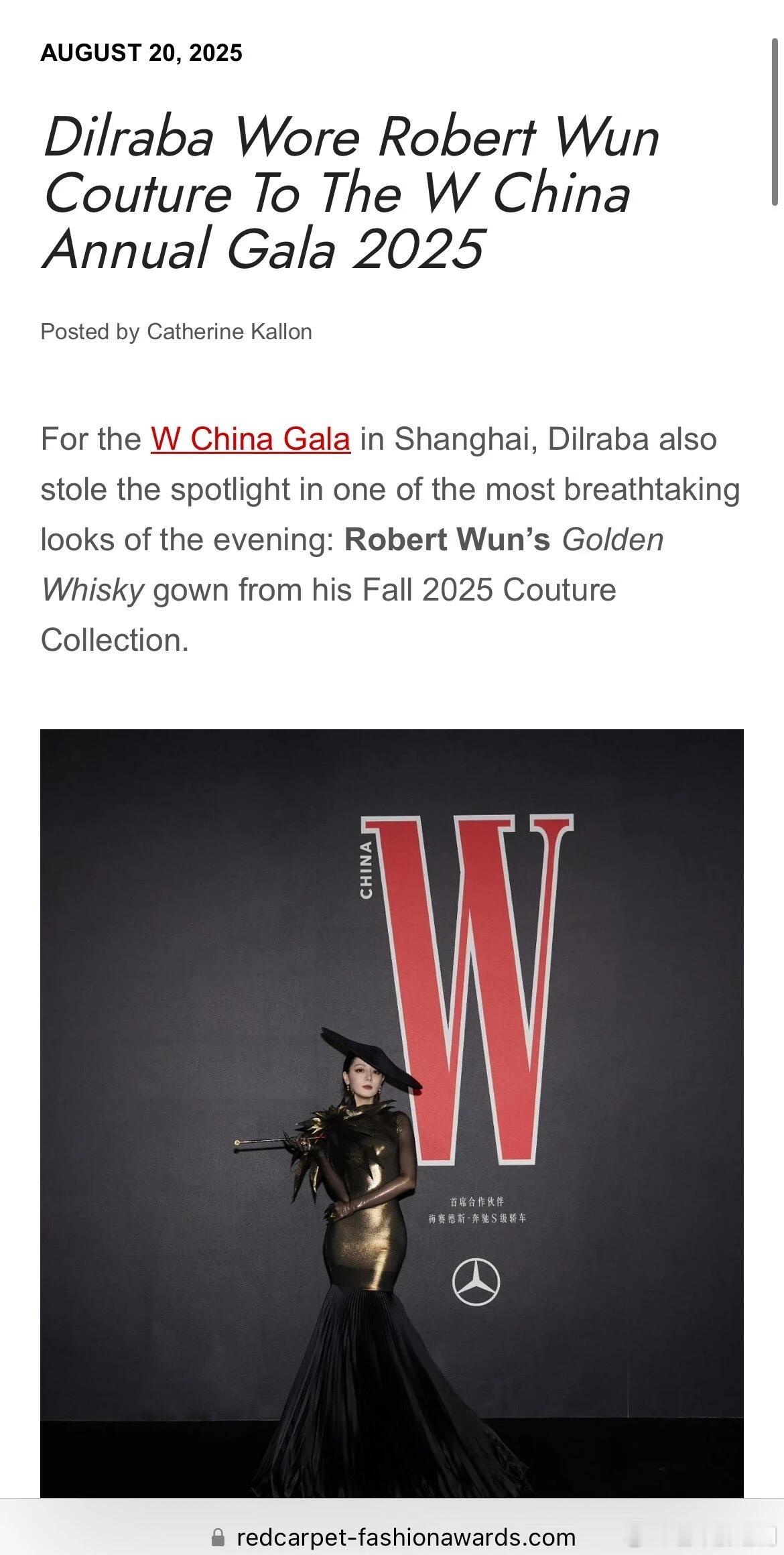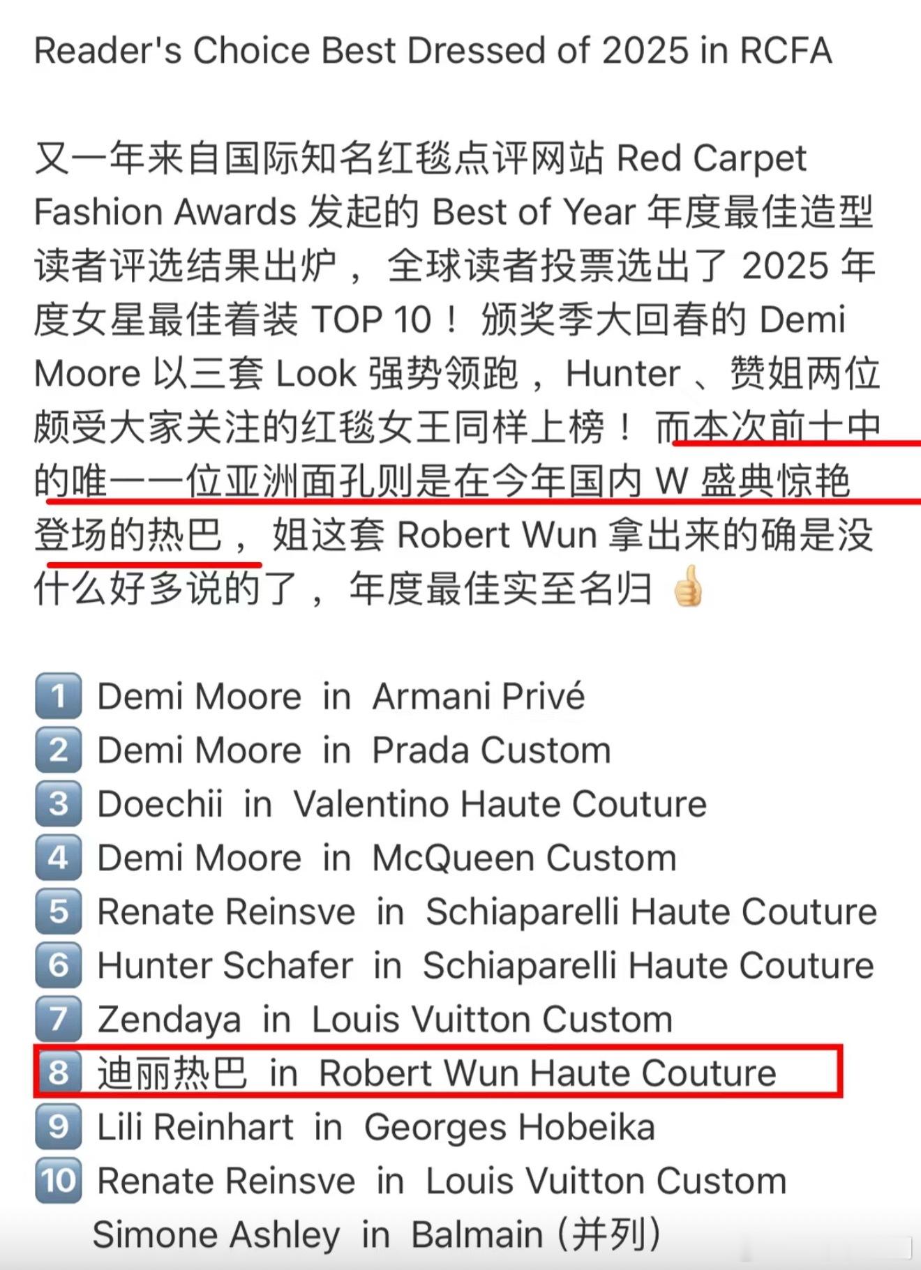 全球国际时尚媒体RCFA评选迪丽热巴为2025最佳着装榜单前十唯一亚洲面孔,更强