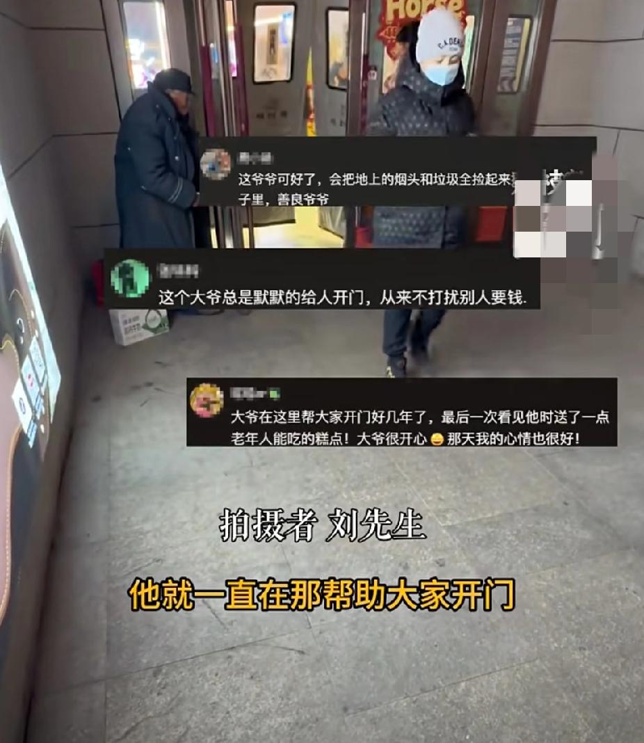 暖心!70岁流浪老人寒风中默默为来往路人扶商场的门,却从不伸手乞讨!网友随手一发,老人收到来自“天南海北”的温暖! 1月2日,辽宁盘锦的刘先生逛商场时看到一位穿着军大衣的70岁左右的老人,在商场门口外一直扶着那扇重重的门。商场里面温暖如春,门外却寒风凛冽,老人一直站在那,默默地为来往的客人扶着门。 老人一动不动的扶着门,大多数客人只是看了一眼老人便离开了,有的人甚至都没有看到老人。 刘先生却被老人吸引了注意力,老人带着一个盆,应该是乞讨用的。但是老人默默地帮助开阳路人,却自始至终没有伸手乞讨。 不仅如此,老人看到地上有烟头或者垃圾,都会主动捡起来扔进垃圾桶,商场门口始终干干净净。 刘先生随手拍下视频发到了网上,没想到却意外火了,各地网友的爱心给老人带来了一个温暖的冬天。 有的当地人买东西是会给老人带一箱牛奶,有的人会给老人送来崭新的棉衣和棉毛,还有人给老人塞钱,二十元、五十元…… 外地的网友们则借助刘先生的手纷纷为老人捐钱,老人默默为路人扶门许久,却突然成了大家的团宠,老人有些受宠若惊。 有网友说,老人在这里扶门已经好几年了,大家都亲切的称呼老人为“开门爷爷”。老人虽然带着盆,但是从不乞讨,坚持付出自己的劳动。虽然大部分人还是会对他视而不见,但是一顶帽子、一件棉衣、一箱牛奶对于老人来说,都是无比的珍贵。 好心人的帮助或许不能让他富裕起来,但至少在这个冬天,老人不用再那么寒冷!老人一把年纪却坚持用自己劳动换取报酬,这样的老人也值得我们尊敬! 辽宁