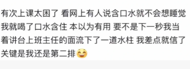 有次上课太困了,看网上有人说含口水就不会想睡觉,我就喝了口水含住,本以为有用,要不是下一秒我当着讲台上班主任的面流下了一道水柱, 我差点就信了,关键是我还是第二排
