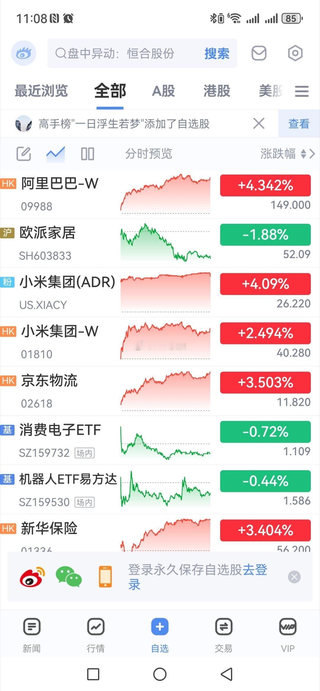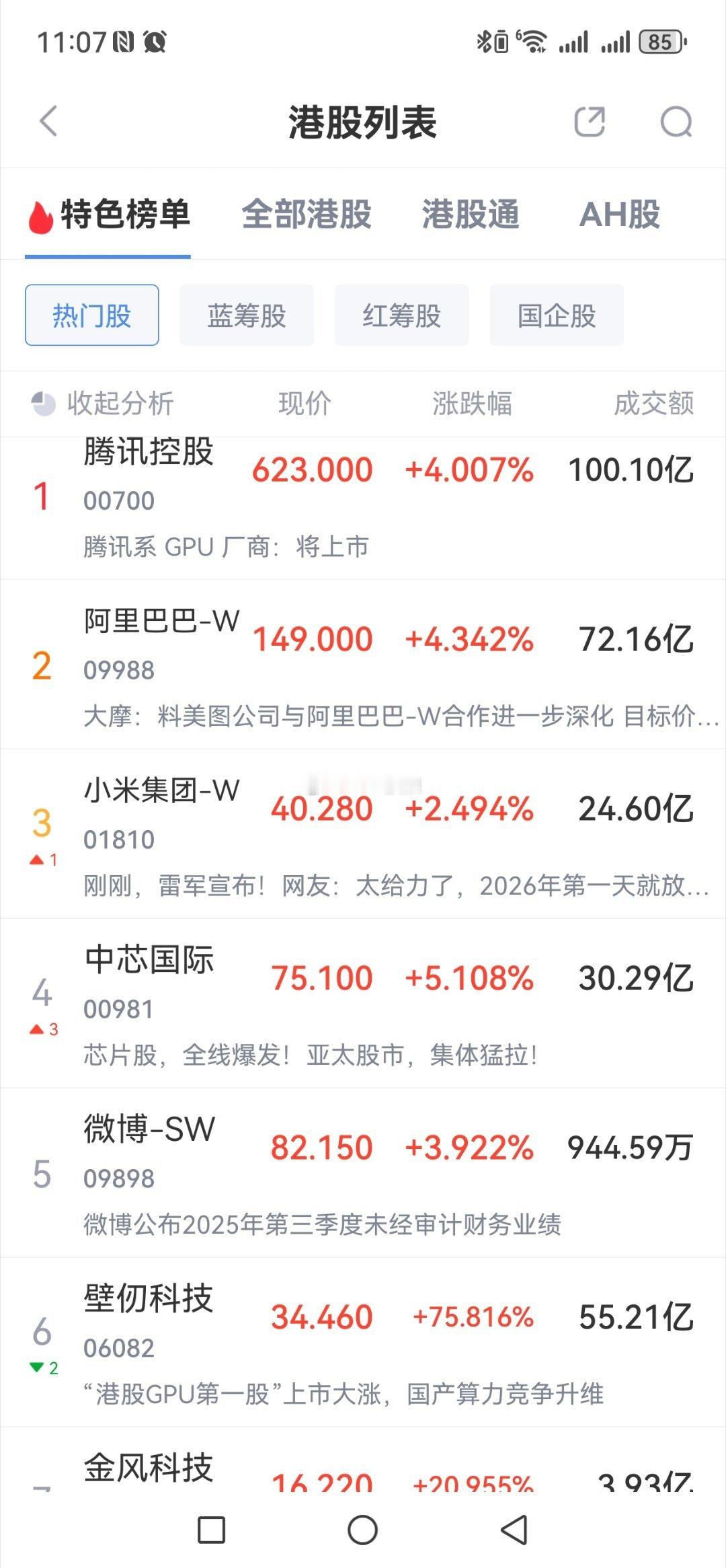 周五港股飘红、科技板块大幅反弹贵金属(有色)、5G与AI半导体及保险和软件处涨幅榜前列。料周一A股开盘或高开。