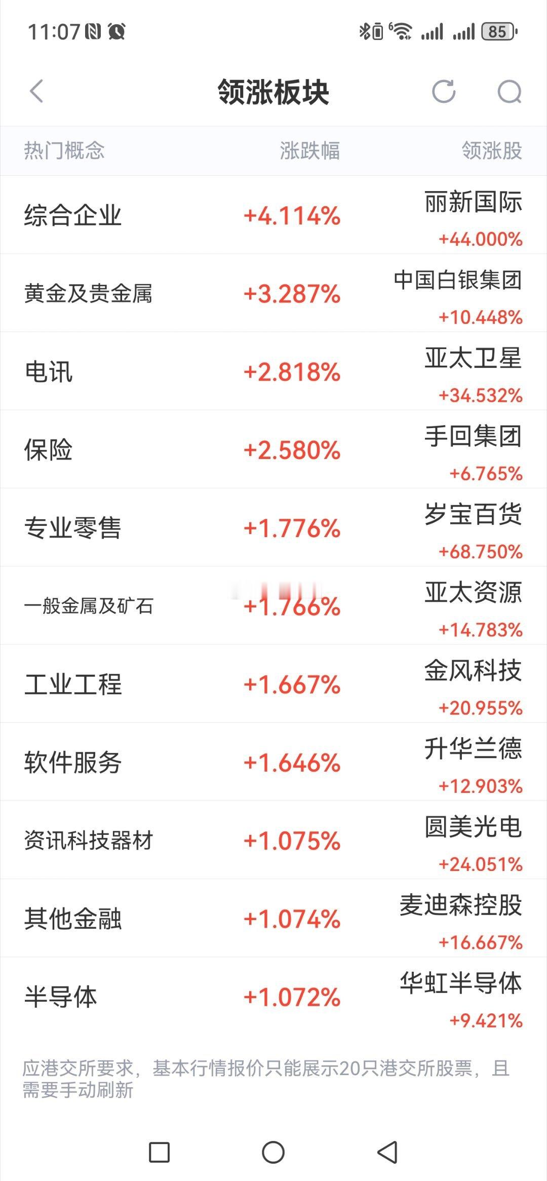 周五港股飘红、科技板块大幅反弹贵金属(有色)、5G与AI半导体及保险和软件处涨幅