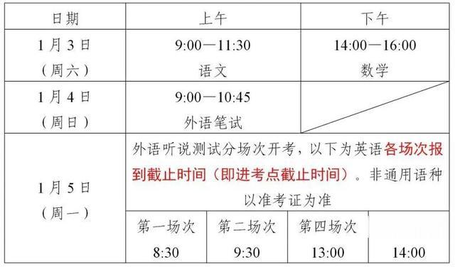 根据考试日程安排,春考于1月3日至5日进行,其中3日上午考语文、下午考数学;4日上午考外语笔试(含听力);5日考外语听说测试。