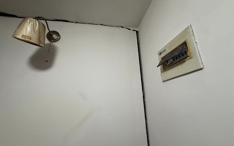 2025年12月25日,记者在现场看到,冯女士家卫生间门口的一面仪容镜,因受墙体裂缝张力影响,有一个角已被挤碎。半个月前,他们用刻度尺量了屋里墙面的裂缝,最宽处可达2厘米。
