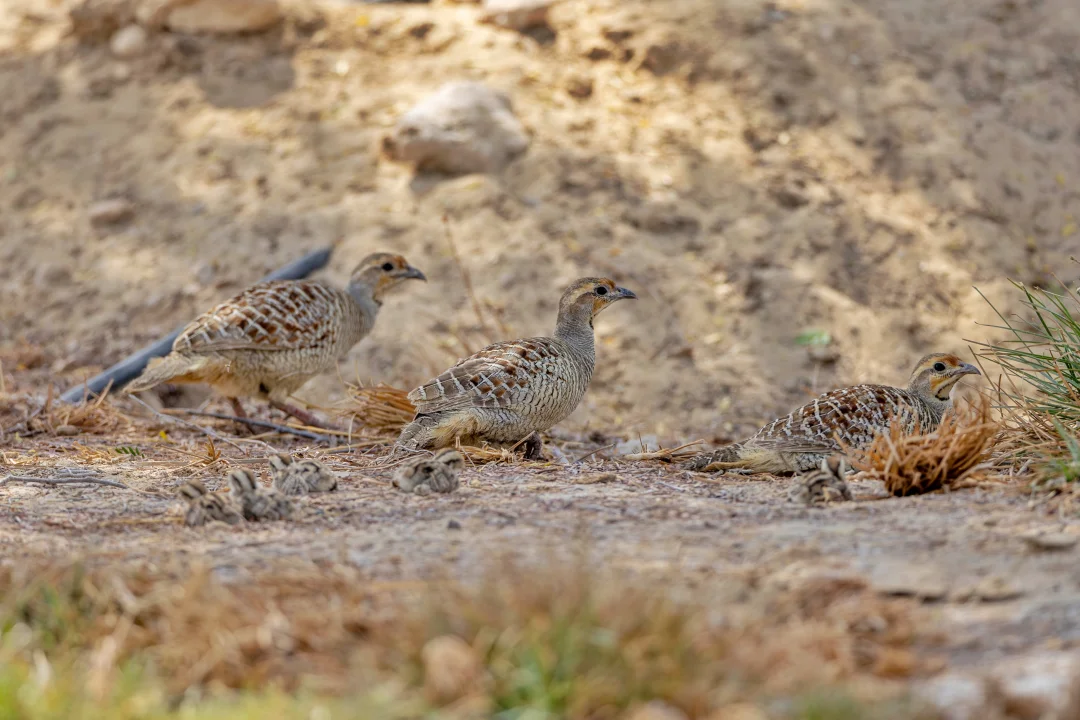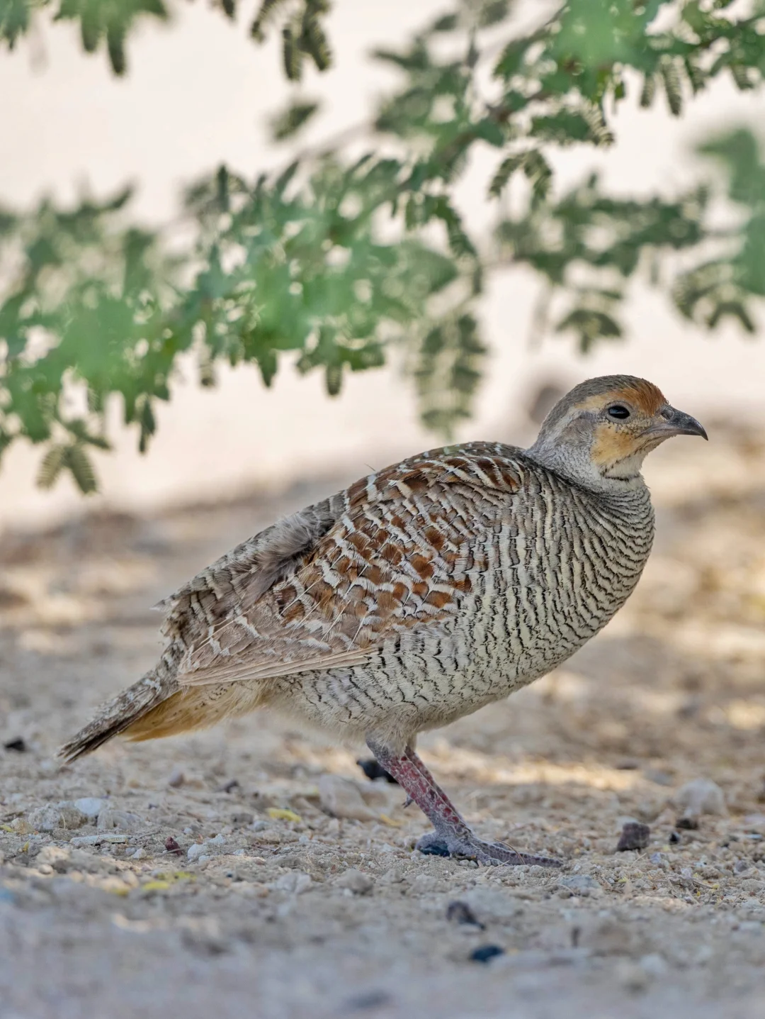 原创拍摄于2025.05 灰鹧鸪,Grey Francolin,鸡形目雉科 Ortygornis 属的鸟类。分布于南亚到西亚地区,既能在开放草地出没,也能在干燥沙漠生活。 灰鹧鸪整体灰色,下体淡黄,前额、头部两侧和眼眉有一点淡红色。身上遍布深色条纹。 阿拉伯半岛的沙漠地貌,零星有一些草丛灌木植被,似乎非常适合灰鹧鸪生活,让它们能够在这里快乐的繁衍。就是太热了,要找个植被遮阳。