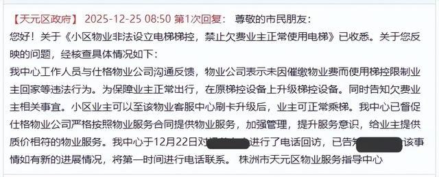 1月3日,有湖南株洲市民投诉:2025年12月11日,天元区黑龙江路提香蓝岸小区,物业公司是仕格物业。该物业公司借系统升级为由,设置使用权限,将欠费(物业费)业主设置进入黑名单,不允许其使用电梯进入楼层,造成大量业主自行爬楼回家,给老人、小孩、孕妇带来居多不便。晚下班高峰,导致大量业主滞留室外......