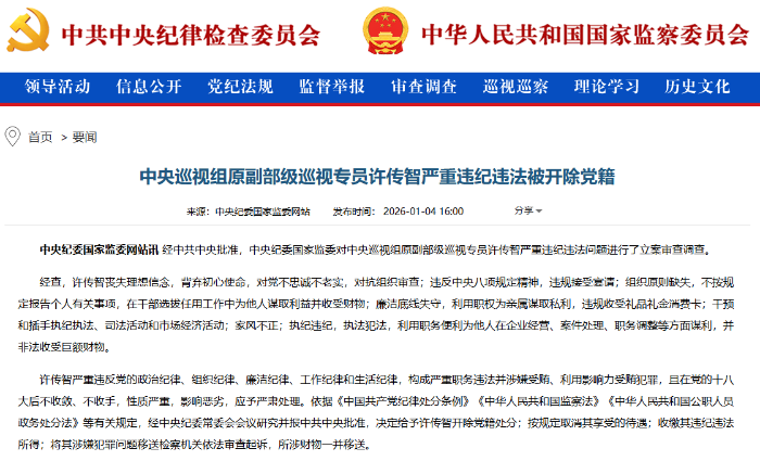 许传智严重违反党的政治纪律、组织纪律、廉洁纪律、工作纪律和生活纪律,构成严重职务违法并涉嫌受贿、利用影响力受贿犯罪,且在党的十八大后不收敛、不收手,性质严重,影响恶劣,应予严肃处理。依据《中国共产党纪律处分条例》《中华人民共和国监察法》《中华人民共和国公职人员政务处分法》等有关规定,经中央纪委常委会会议研究并报中共中央批准,决定给予许传智开除党籍处分;按规定取消其享受的待遇;收缴其违纪违法所得;将其涉嫌犯罪问题移送检察机关依法审查起诉,所涉财物一并移送。(总台央视记者宋琎)