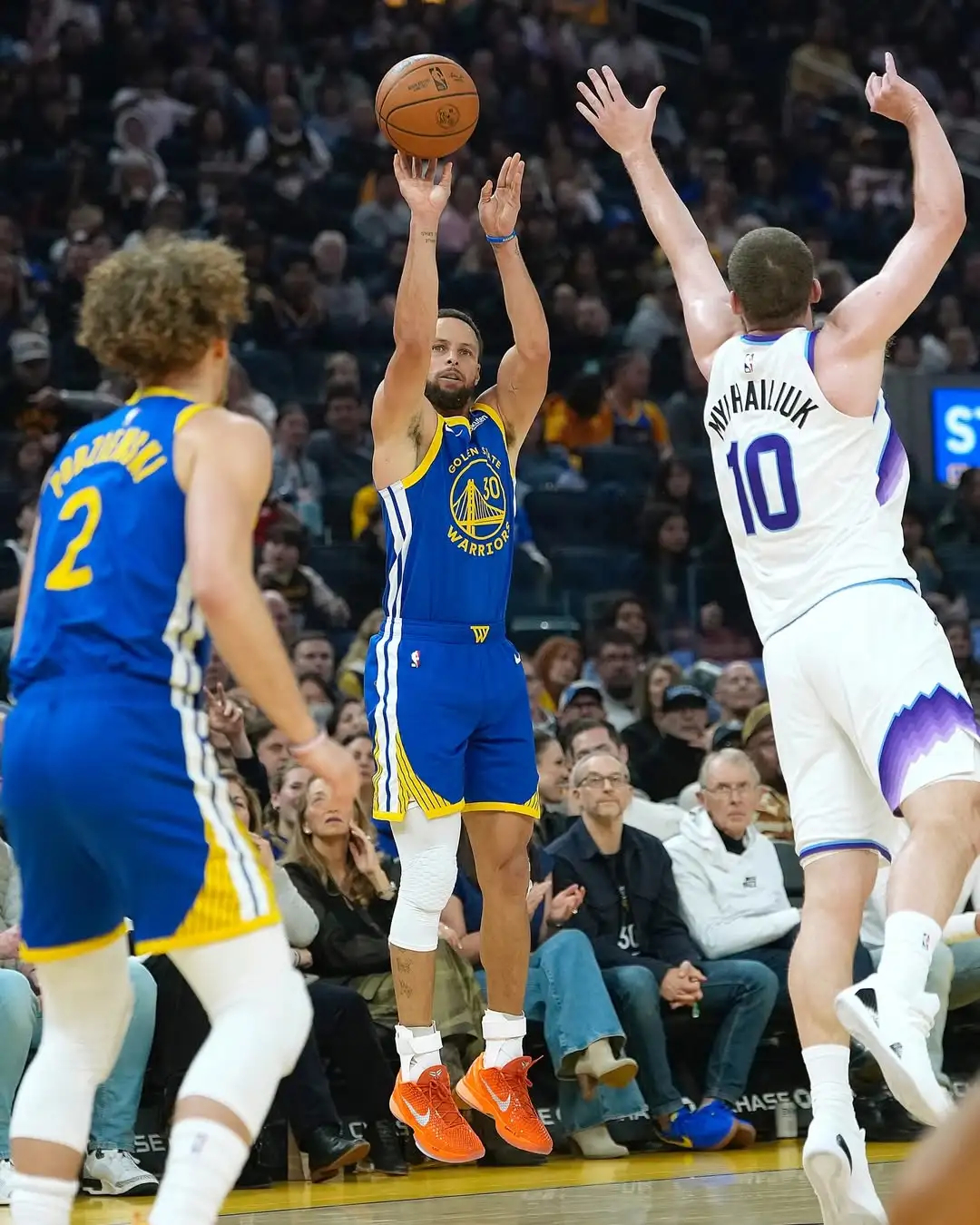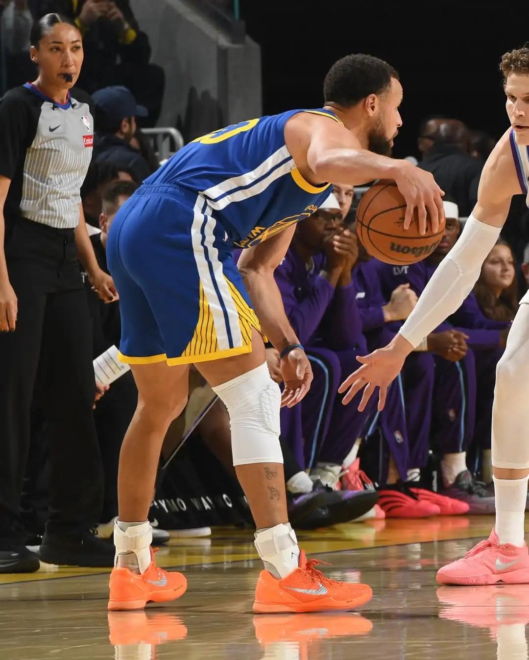 今日勇士123-114战胜爵士。库里穿着亮橙色科比6,得到31分2篮板5助攻1抢