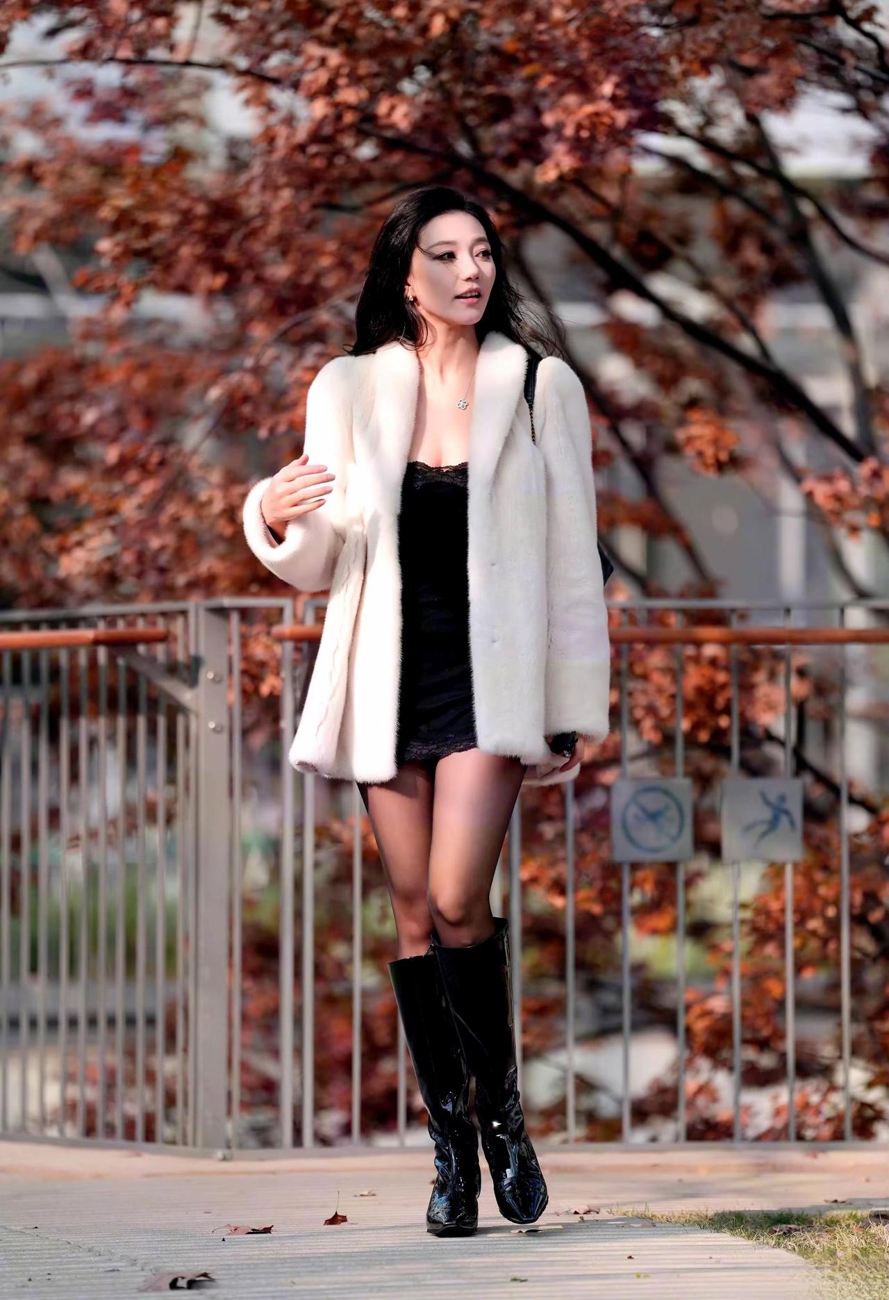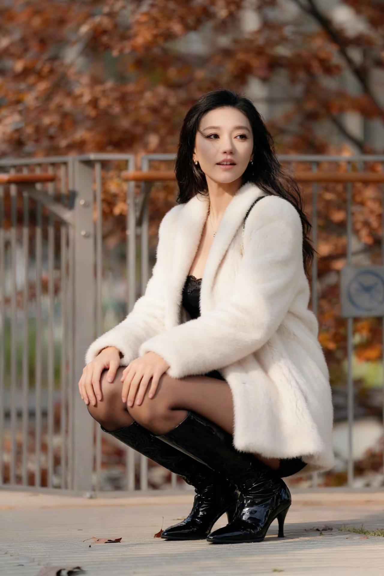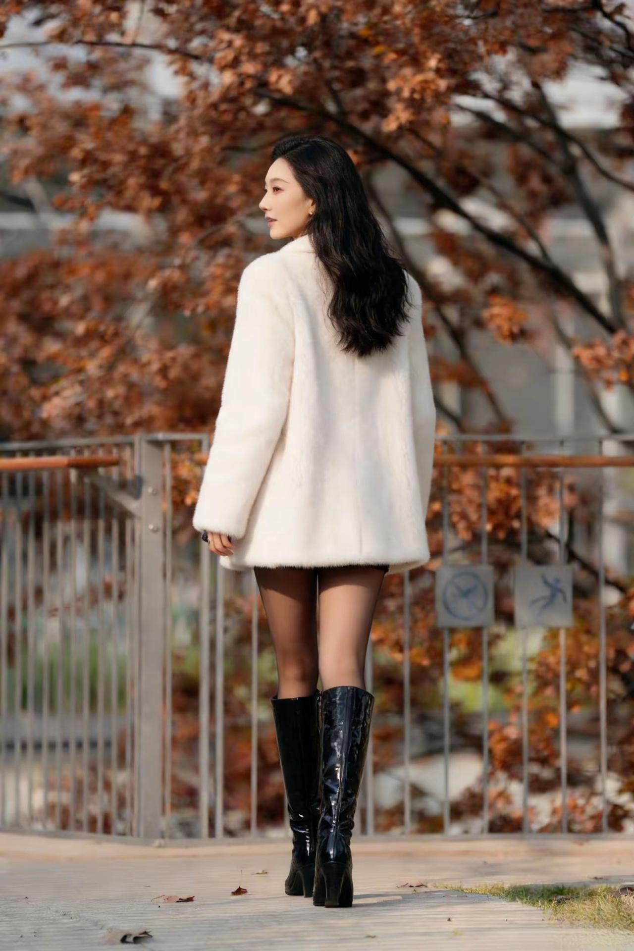冬日森林中的时尚穿搭,毛绒外套与黑色皮裤的完美结合,尽显优雅与温暖。
