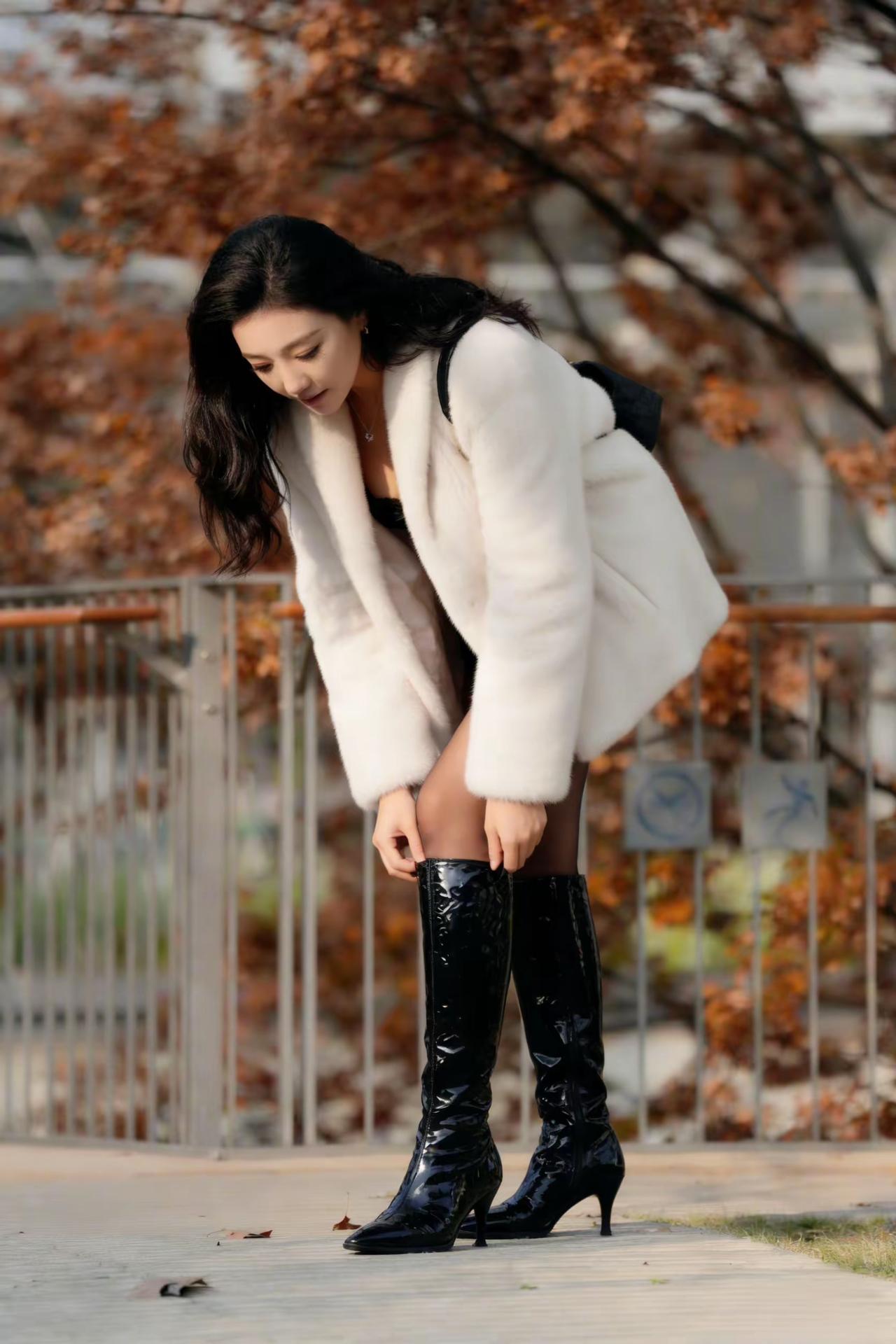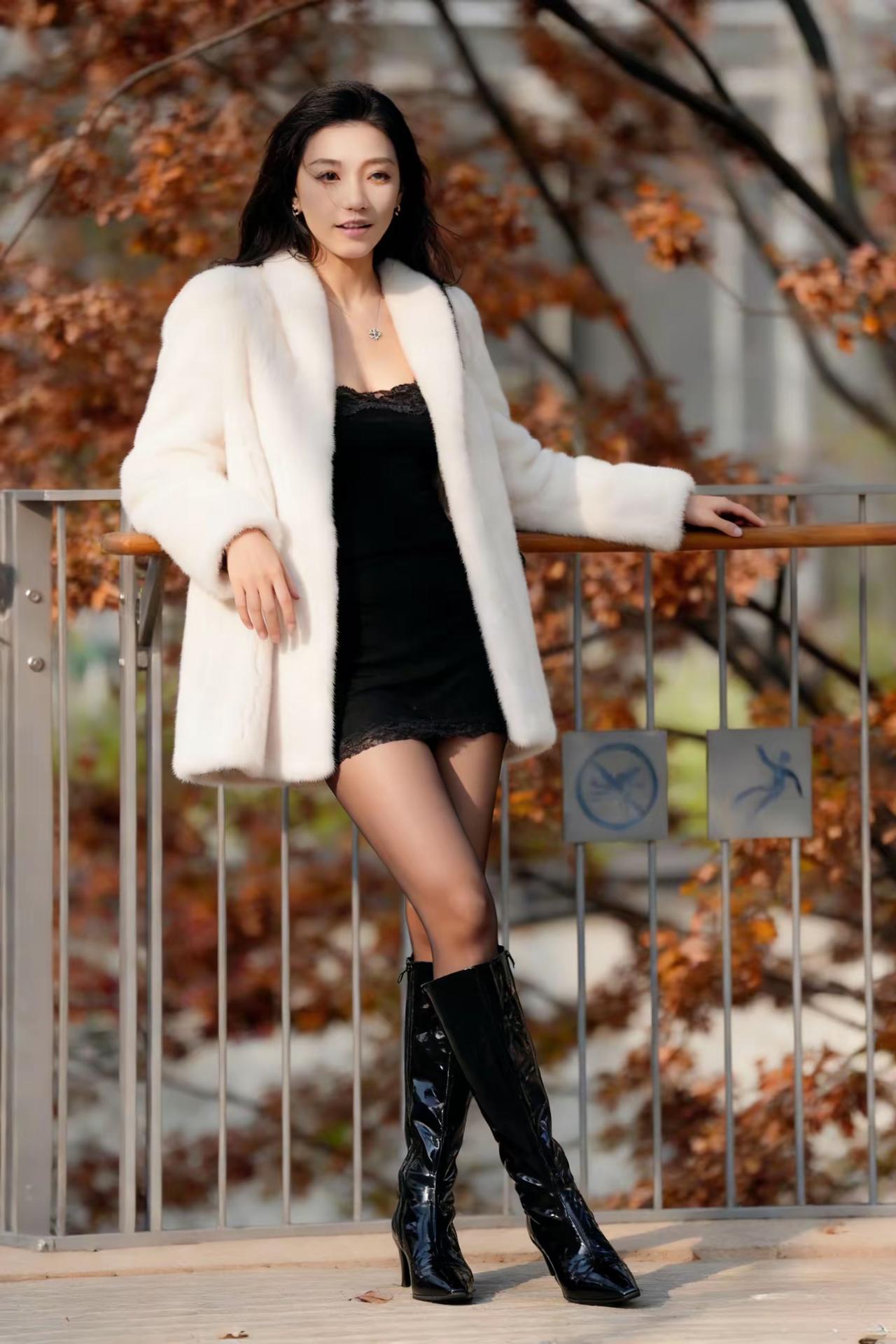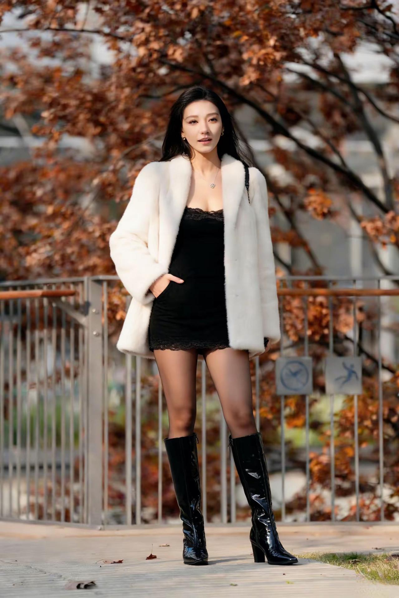 冬日森林中的时尚穿搭,毛绒外套与黑色皮裤的完美结合,尽显优雅与温暖。
