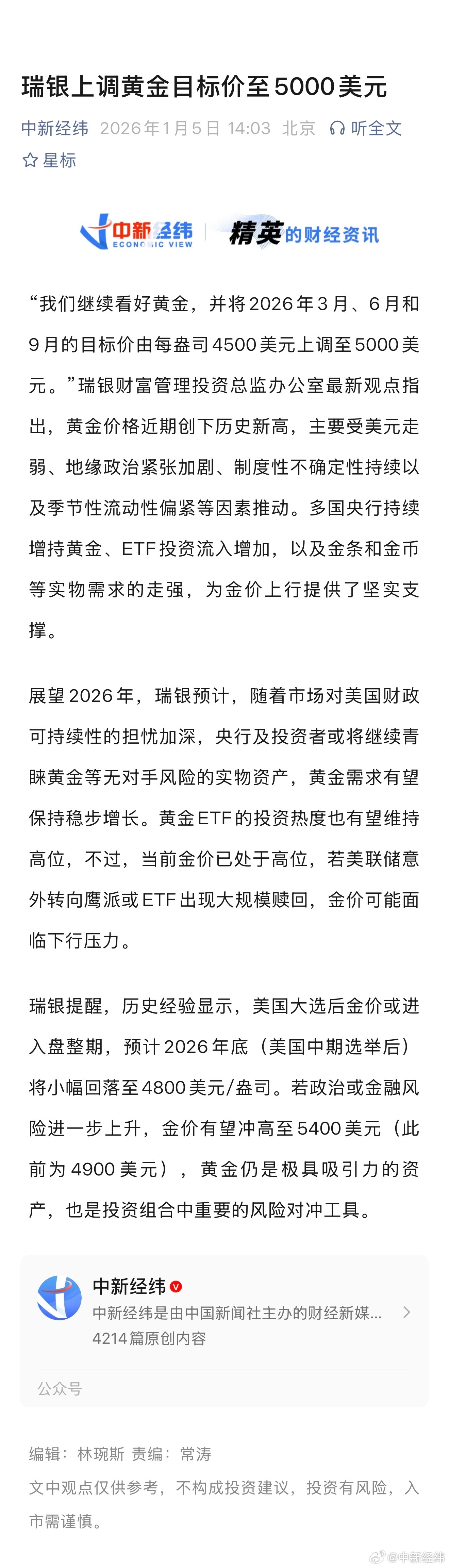 [#瑞银上调黄金目标价至5千美元#]“我们继续看好黄金,并将2026年3月、6月和9月的目标价由每盎司4500美元上调至5000美元。”瑞银财富管理投资总监办公室最新观点指出,黄金价格近期创下历史新高,主要受美元走弱、地缘政治紧张加剧、制度性不确定性持续以及季节性流动性偏紧等因素推动。多国央行持续增持黄金、ETF投资流入增加,以及金条和金币等实物需求的走强,为金价上行提供了坚实支撑。