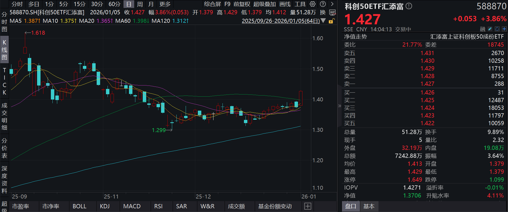 截至2026年1月5日14:04,上证科创板50成份指数(000688)强势上涨4.16%,成分股中微公司(688012)上涨14.09%,澜起科技(688008)上涨8.41%,柏楚电子(688188)上涨7.96%,佰维存储(688525),拓荆科技(688072)等个股跟涨。科创50ETF汇添富(588870)上涨3.86%,最新价报1.43元。拉长时间看,截至2025年12月31日,科创50ETF汇添富近2周累计上涨2.84%。(以上所列股票仅为指数成份股,无特定推荐之意)