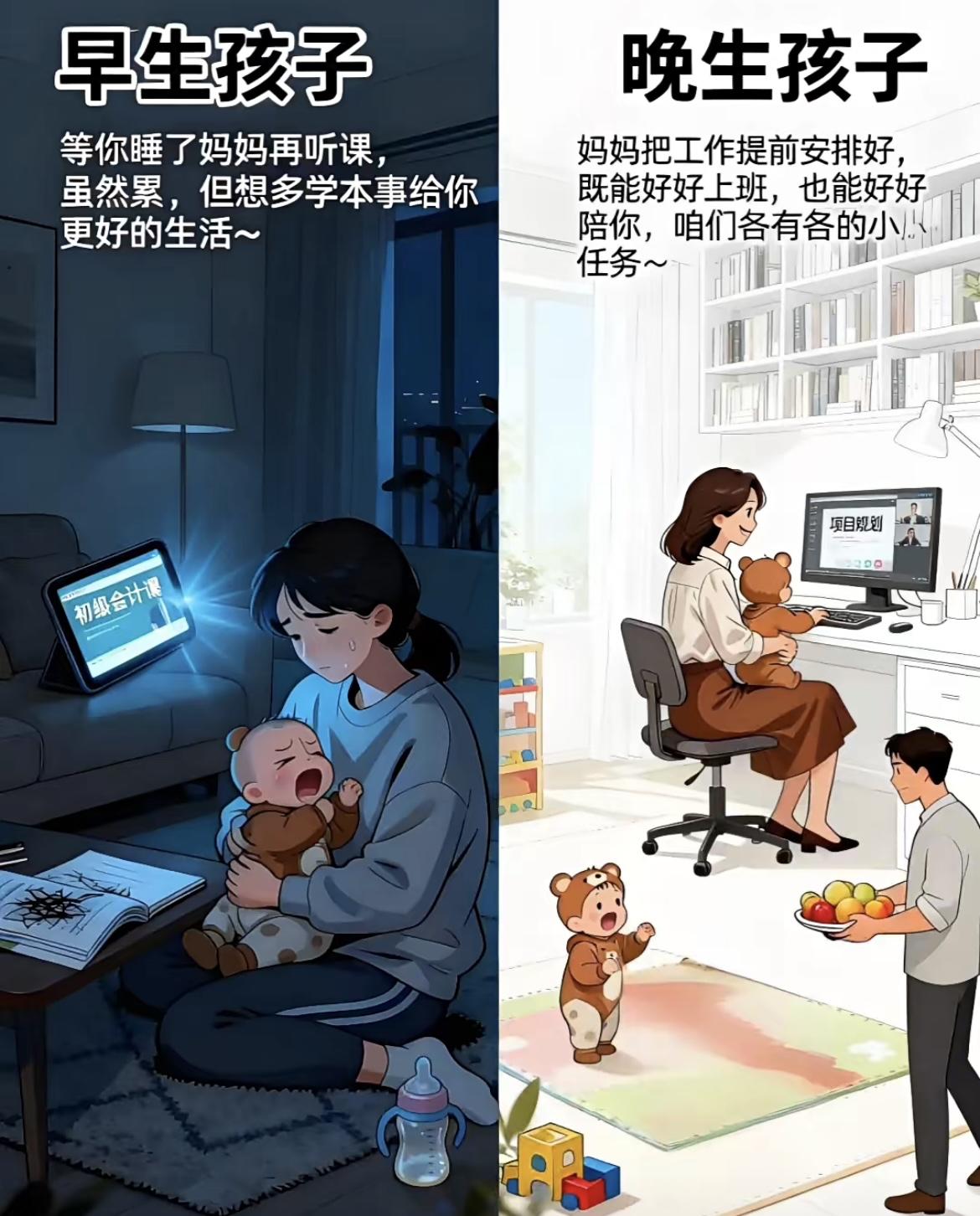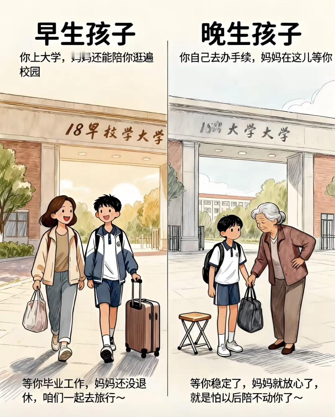 早生娃 vs 晚生娃,核心区别一目了然 1. 精力状态 早生(20-25岁):体力充沛,能陪孩子跑跳、疯玩到天黑,全程保持高活力。 晚生(35-40岁):体力稍弱,陪伴时易腰酸疲惫,更适合短时间、温和的亲子互动。 2. 养育方式 早生:更依赖长辈经验,养育偏传统,物质条件有限时,靠手工(纸箱做玩具)等简单方式创造乐趣。 晚生:遵循科学育儿,会做成长记录、科学配比饮食,物质条件更优,能提供早教机、亲子乐园等丰富资源。 3. 人生阶段匹配 早生:孩子上大学、工作时,自己仍处于壮年,能陪逛校园、退休前还能一起旅行。 晚生:孩子成长关键节点,自身年龄偏大,可能体力跟不上,甚至担心未来陪伴时长。 4. 事业与经济 早生:事业刚起步,需在育儿间隙挤时间学习提升,经济压力相对较大。 晚生:事业更稳定,能提前规划工作与育儿的平衡,经济基础扎实,能给孩子更安稳的物质支撑。