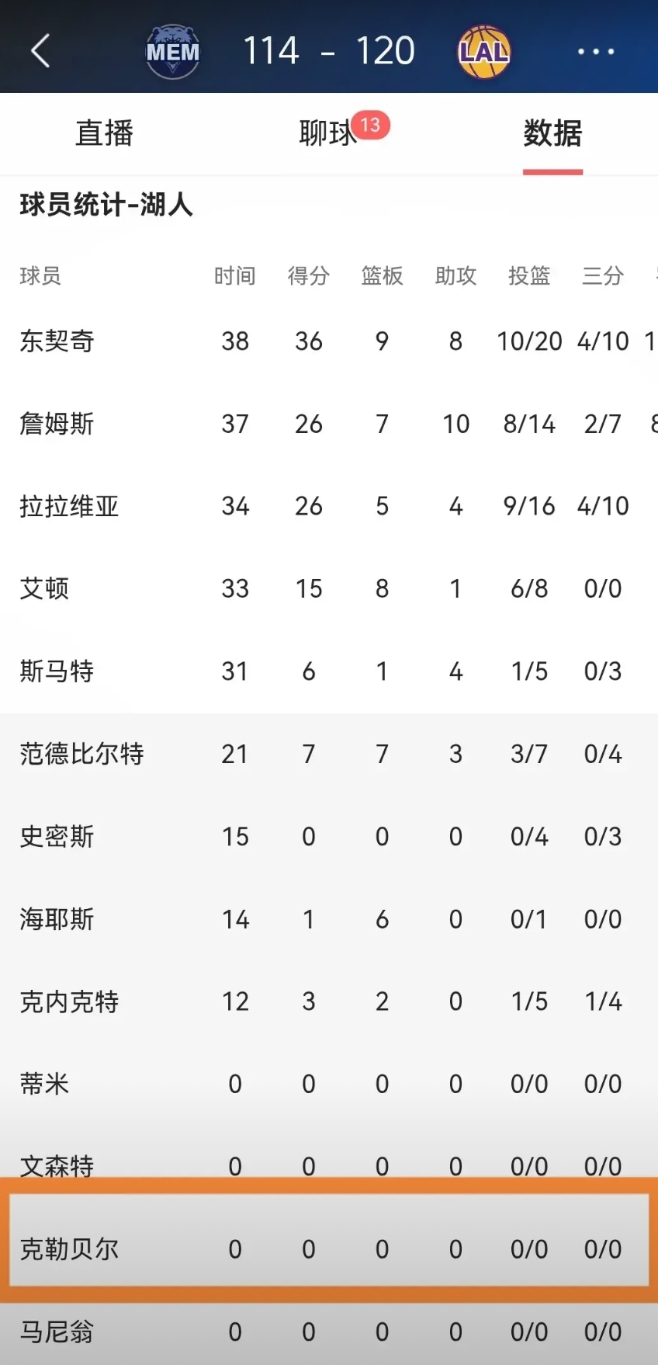 湖人大将克勒贝尔真是彻底的凉凉了!在今天湖人主场以120:114力克灰熊的比赛中,克勒贝尔惨遭主帅雷迪克的无情弃用,坐了一整场的冷板凳。从目前的情况来看,克勒贝尔在湖人的生存空间已经变得非常狭小,雷迪克教练在里弗斯、文森特和八村塁都因伤缺阵的情况下依然没有启用克勒贝尔,这充分说明克勒贝尔完全不在湖人的计划当中,我预感克勒贝尔很有可能会在球员交易截止日前被送走。