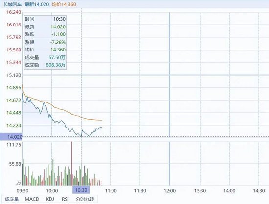 1月5日开盘,长城汽车A股、H股一同低开低走。H股盘中更是一度大跌7.28%。截至收盘,长城汽车A股下跌1.46%,H股下跌6.15%。